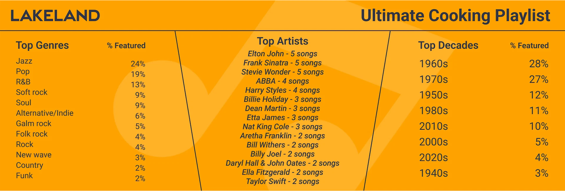 As for the best genres? According to their research, jazz, pop and R&B are the most frequently listened to and themost popular decade was the 1960s. Lakeland’s data also revealed the most popular artists to listen to while cooking, with Elton John, Frank Sinatra and Stevie Wonder sharing the top spot, each having five different songs in the top 100 most popular tracks. ABBA and Harry Styles followed close behind, both with four tracks in the top 100.