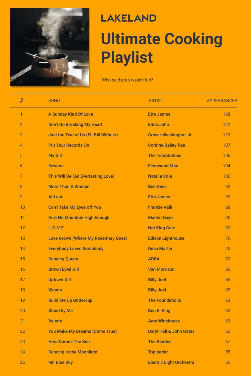 As always, Spotify has done the hard graft and compiled the information for us. Pulling data together from a variety of different playlists, Lakeland – experts in cooking, baking, cleaning and laundry since 1964 – analysed over 2,000 playlists on Spotify, containing almost 250,000 different tracks, to reveal the most popular songs (and artists) being listened to in kitchens around the world.