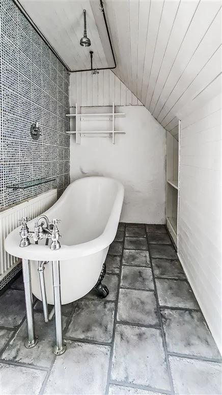 The property oozes charm and character while enjoying many modern conveniences. The cottage has the original cottage style doors, vaulted ceilings, a cast iron solid fuel stove, and thick walls.