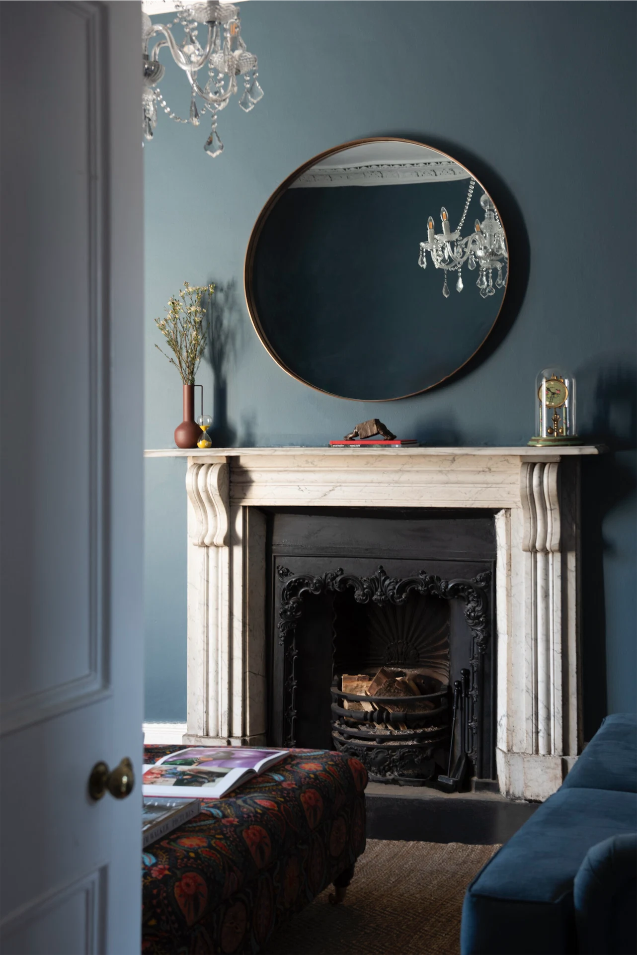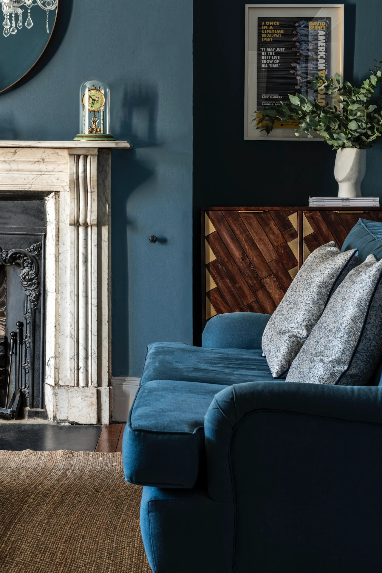 The existing furniture was also a factor when choosing the colour palette for the new home. “For example,” Caroline explains, “the bespoke sofa from his previous home is upholstered in a vintage mid-blue linen, so we selected a warm inky tone for the walls which works beautifully both in the morning light and is also wonderfully subdued in the evening time when the room will be used most.”