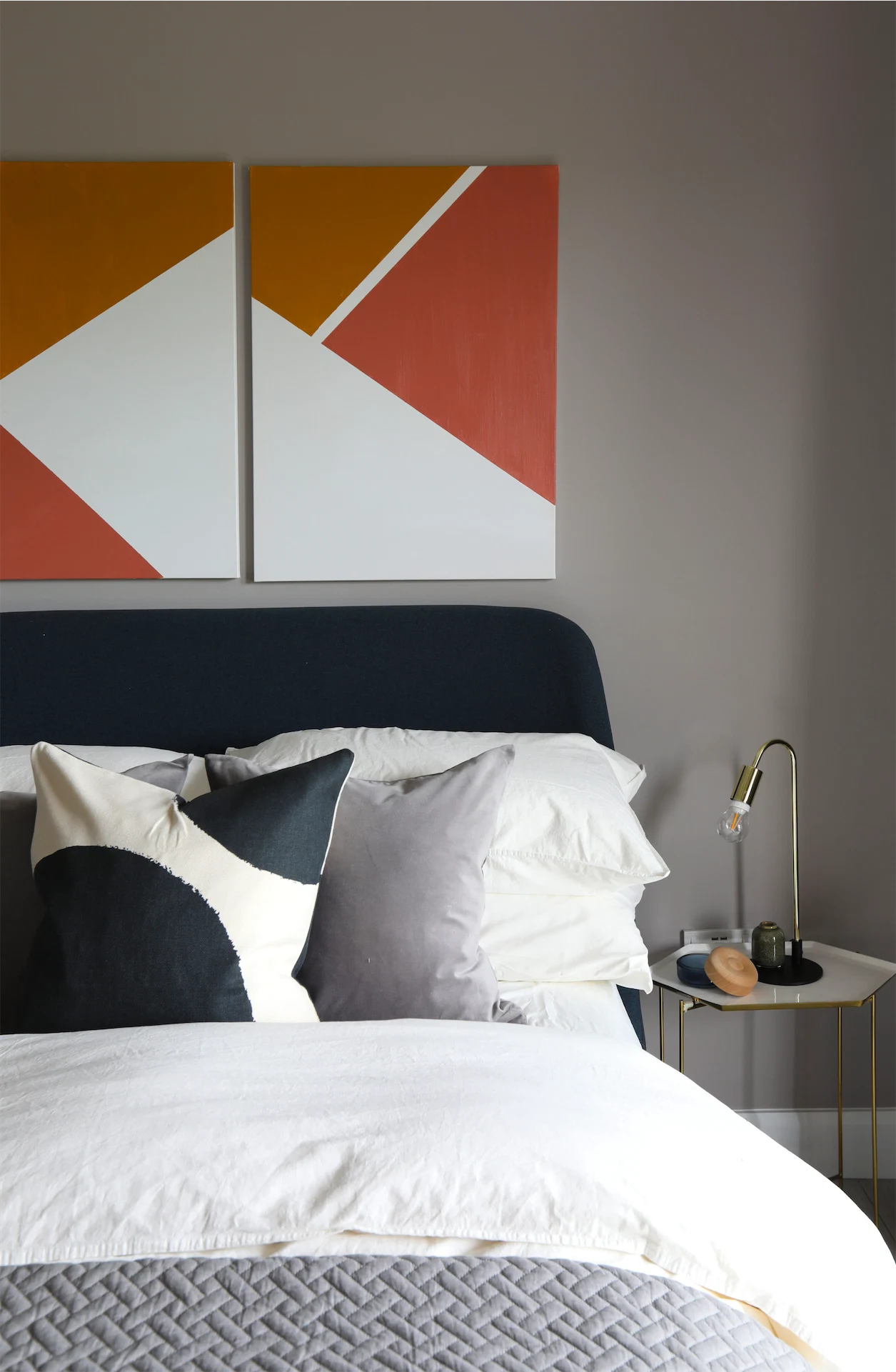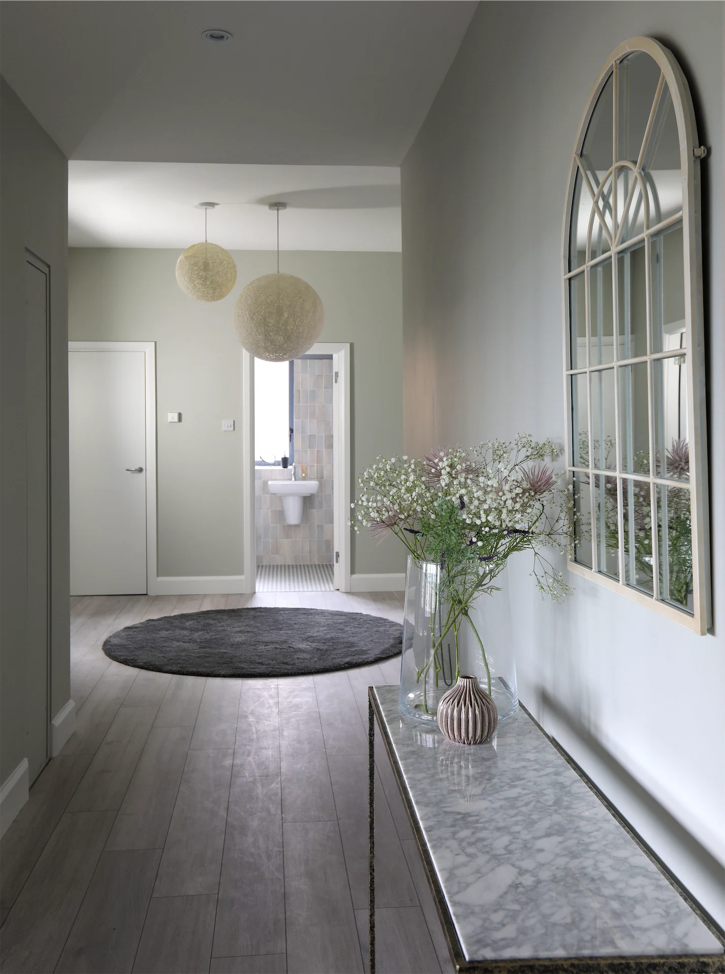 The master suite though is probably Lauren and Louise’s favourite space, considering how much thought went into reconfiguring it. A feature wall and wall-mounted bedside lamps add an extra layer of luxury . In the hallway, the spaciousness is accentuated by two new sphere pendants.