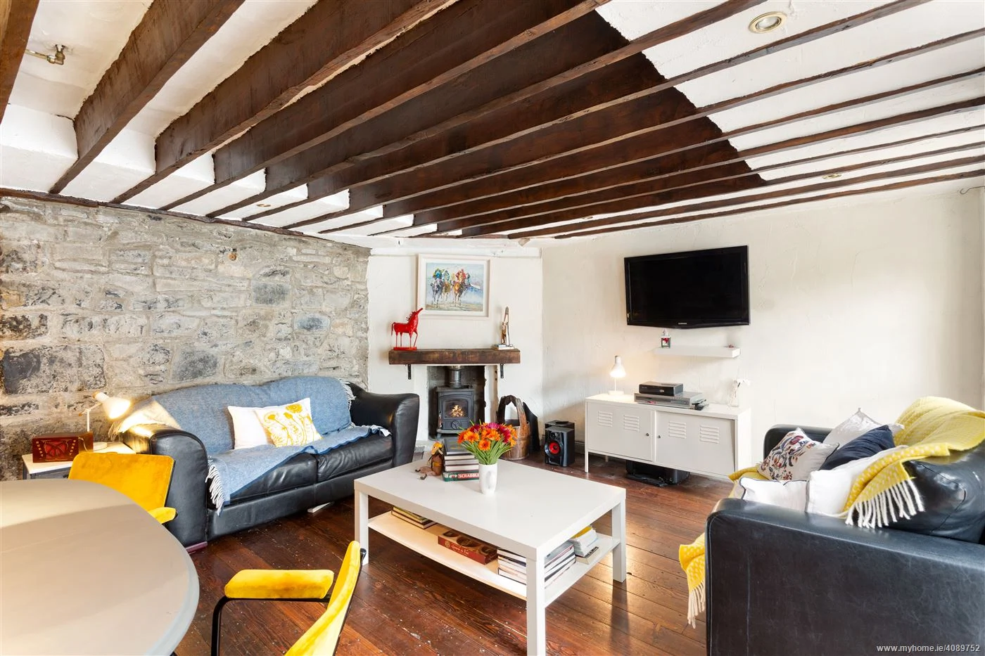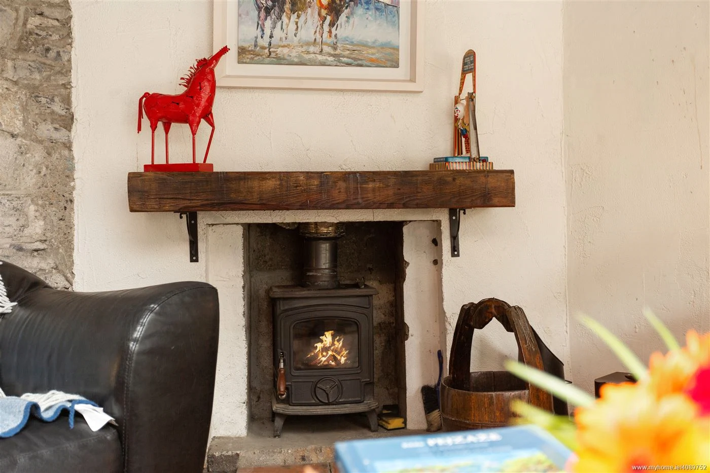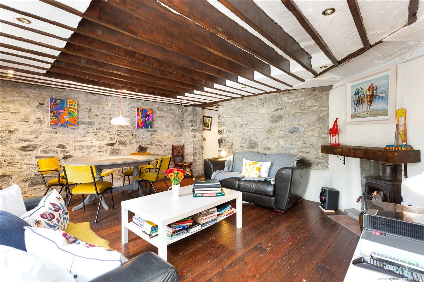 Downstairs, you are greeted by exposed timber beams and rough stone walls in a more relaxed family room. A solid-fuel stove under a timber mantle sits to one corner and you might be forgiven for thinking you’re somewhere much more rural than Dublin 4.