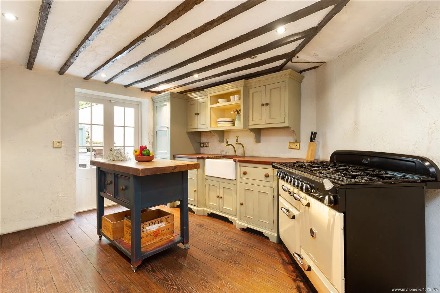 To the rear is a gorgeous country-style, handmade kitchen with a gas range cooker. Double doors lead to a private courtyard with steps up to the back garden.
