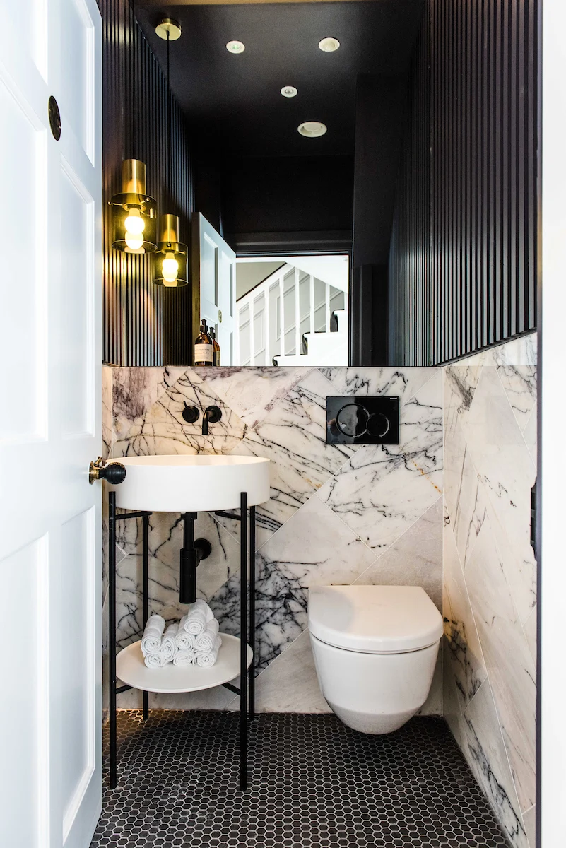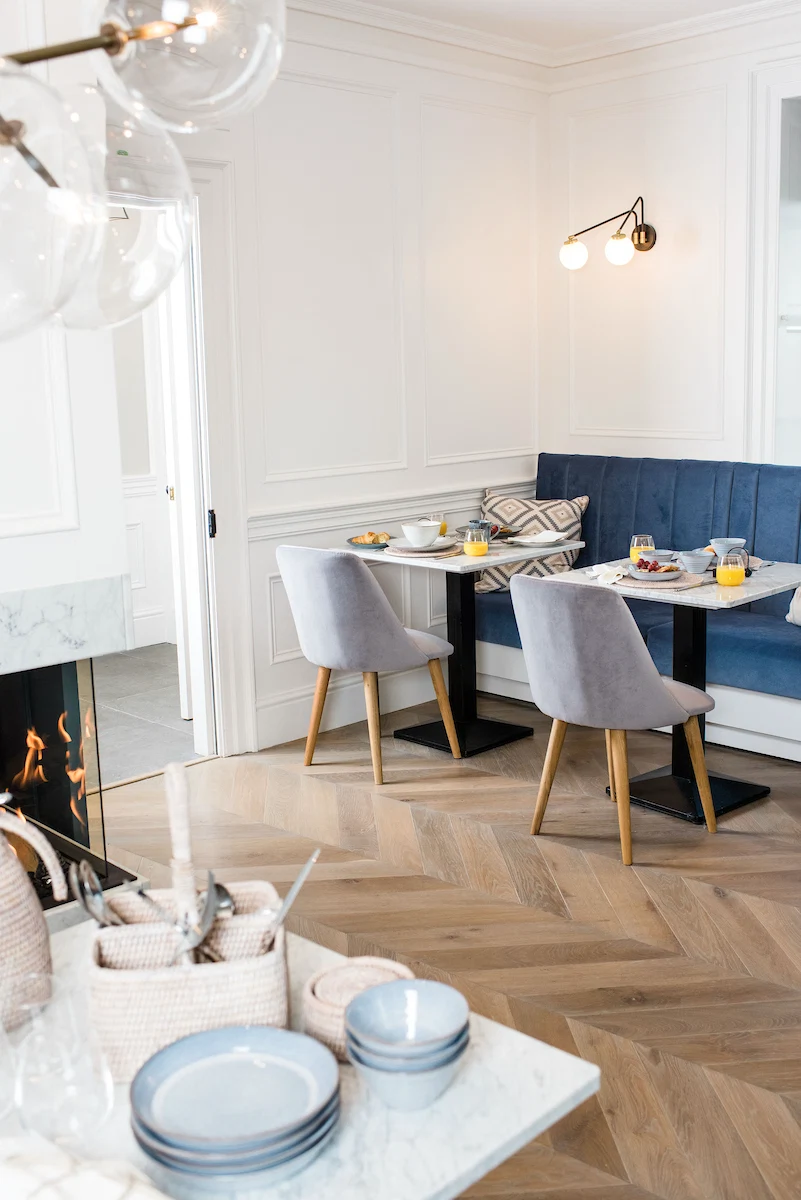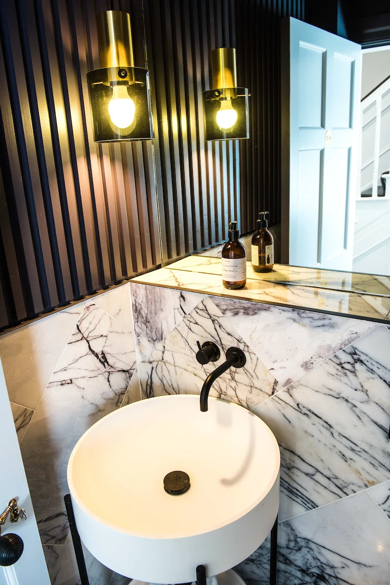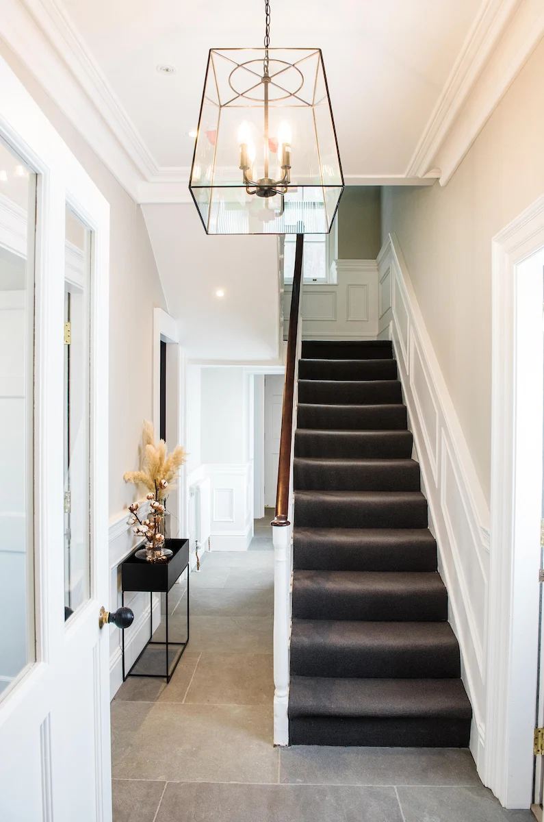 Combining a simple, Scandinavian aesthetic with the ornate period details, interior wood panelling is washed in a matt white, deep window seats allow the well-proportioned windows to frame the views, detailed cornicing and door frames are offset with sharp lines of white marble and mid-century modern lighting. Accessories here are minimal, yet well-considered.