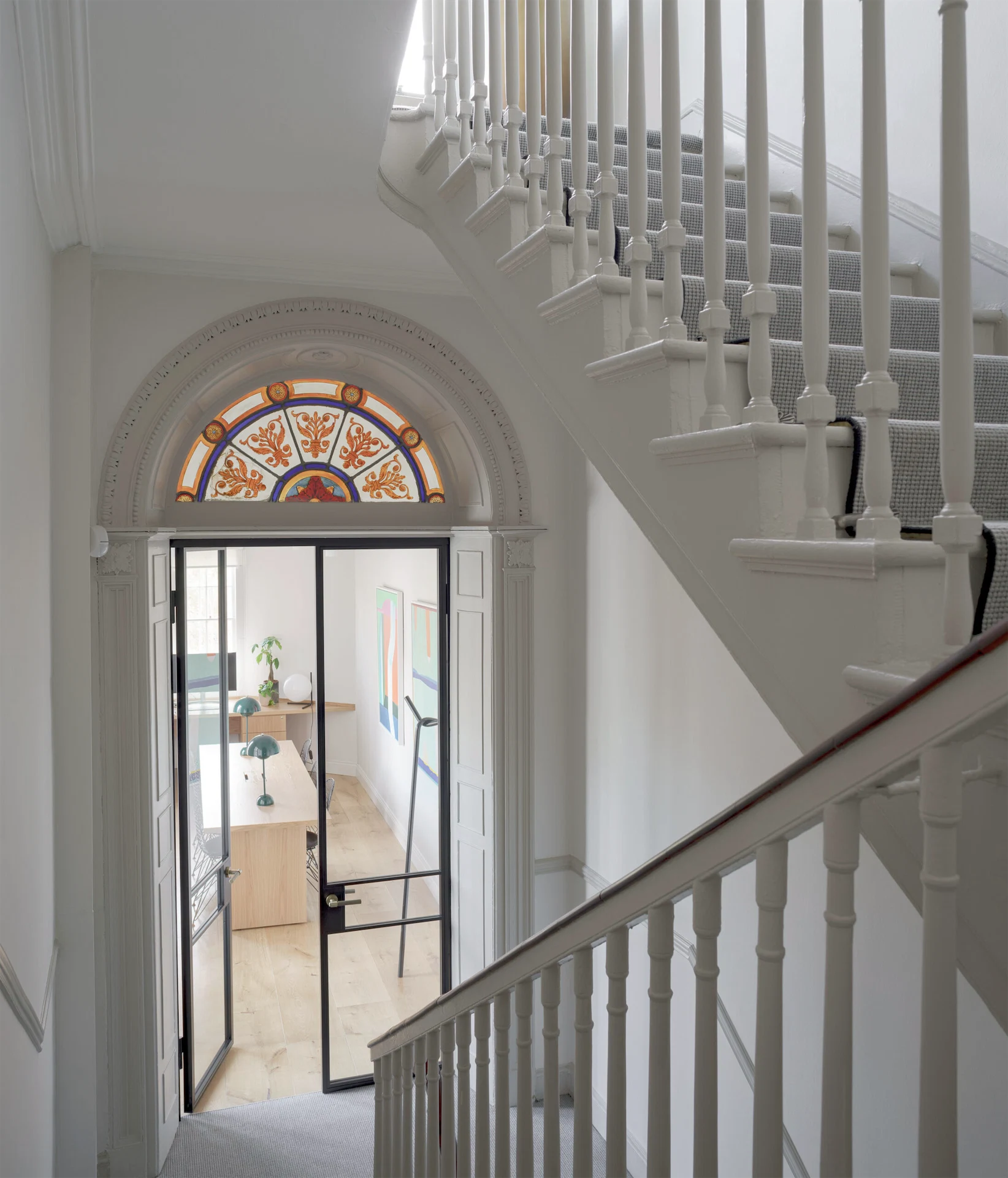 The design involved looking at how a Georgian house could work as a contemporary office space. Rather than adding lots of new ingredients to the mix, the team’s approach was more about highlighting existing features and removing things that were detracting from it. Any new pieces – the kitchen, for example – are contemporary rather than pastiche. That way, there’s a clear contrast between old and new, but one that marries the two together as opposed to creating a divide.