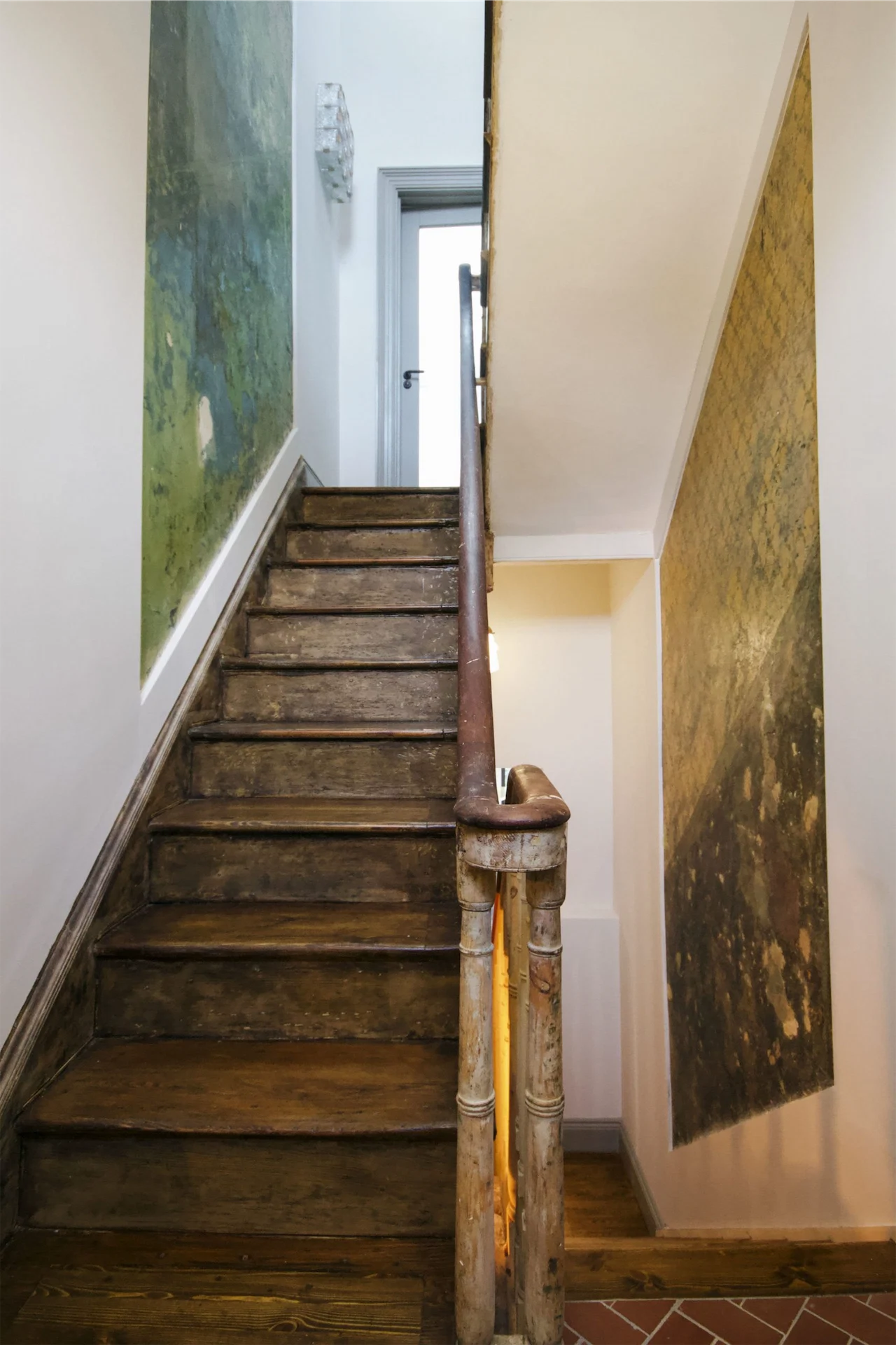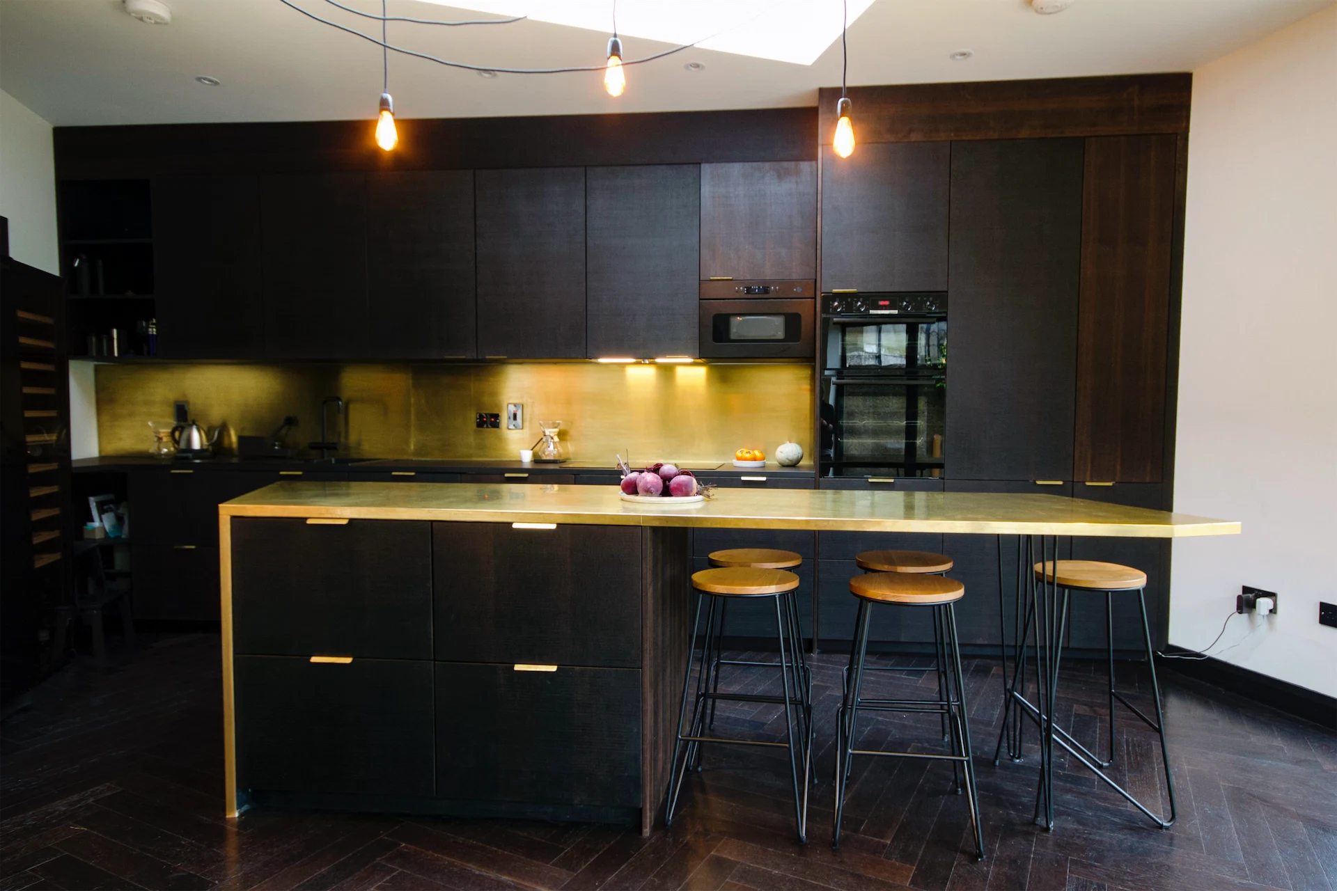 The brass countertop and splashback of the kitchen tie in with the elements of the other living spaces, and the matt grey walls of the bathroom mirror with the exposed plasterwork that’s been framed along the stairwell, framing the layers of history this house has lived through.