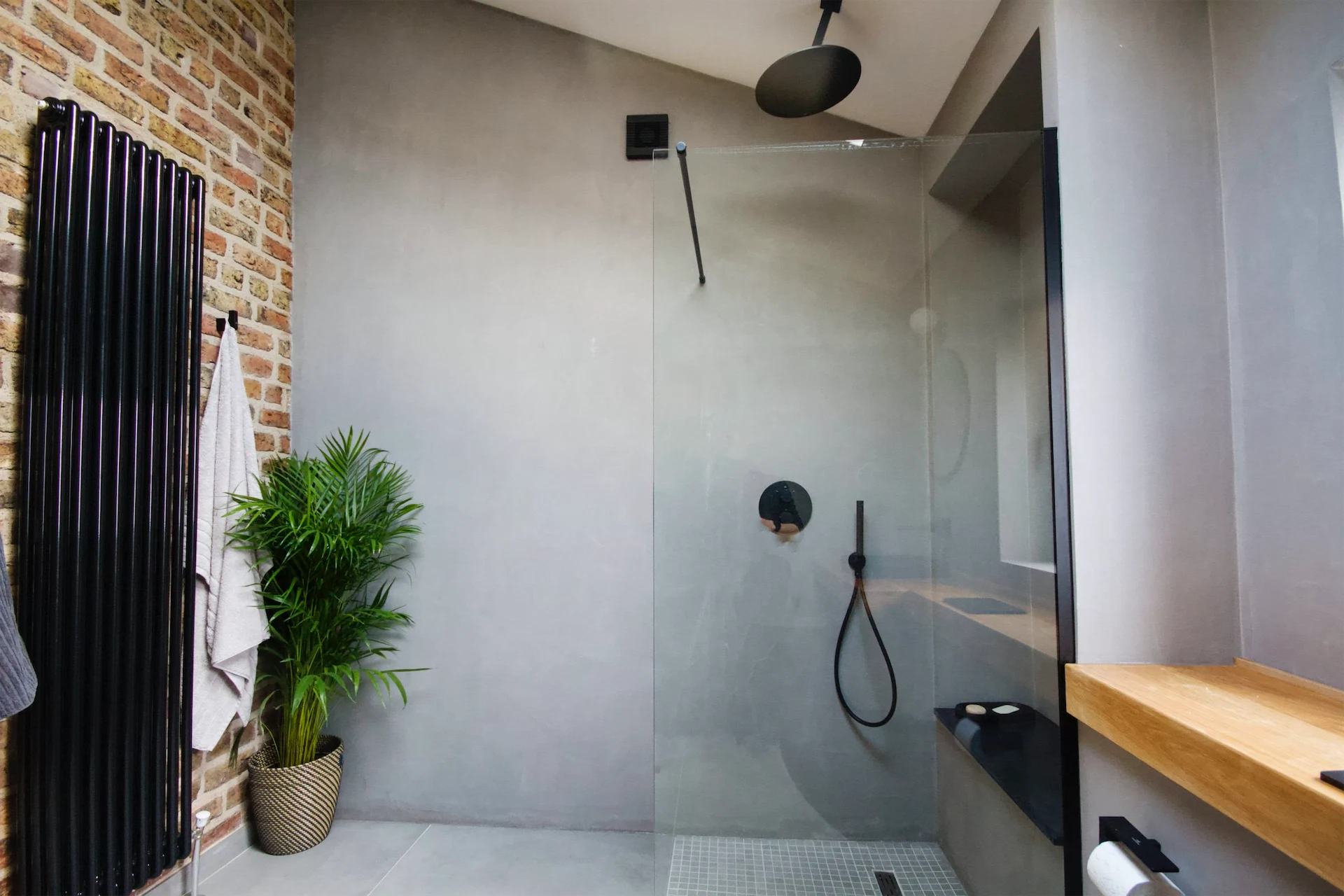 The new bathroom sits above the kitchen, with the original external brick left exposed