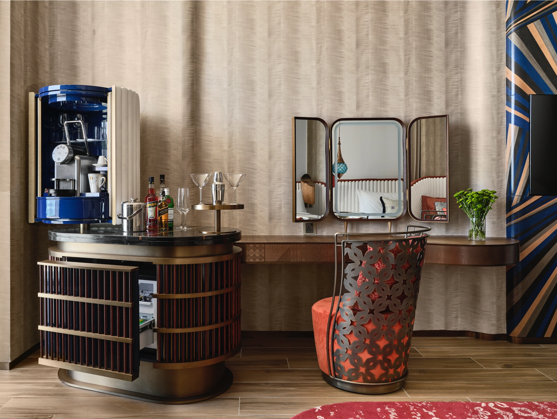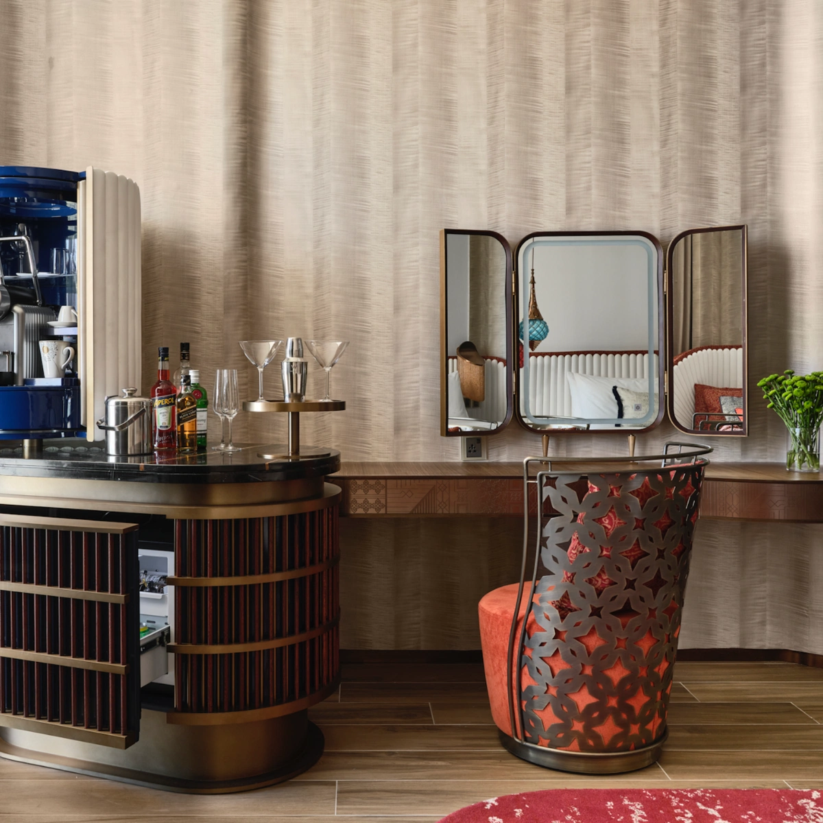 We were eager to see our room after seeing the ground floor of the hotel. When we entered, we were impressed by the Arabian/Bohemian style design with intricate details throughout the room. The hanging lanterns were colourful and cool, and the art Deco-style furnishings added to the overall charm. The walk-in wardrobes were spacious and separated by sheer layered curtains that reminded me of a belly dancer’s skirt. The room offered a spectacular view of the picturesque marina from its spacious balcony, and the retro-style mini bar felt more like a bar than a hotel amenity. But the cherry on top was finding a beautiful collage of pictures of my dogs, Walter and Ralph, curated by the hotel, which they thoughtfully arranged on the table.
