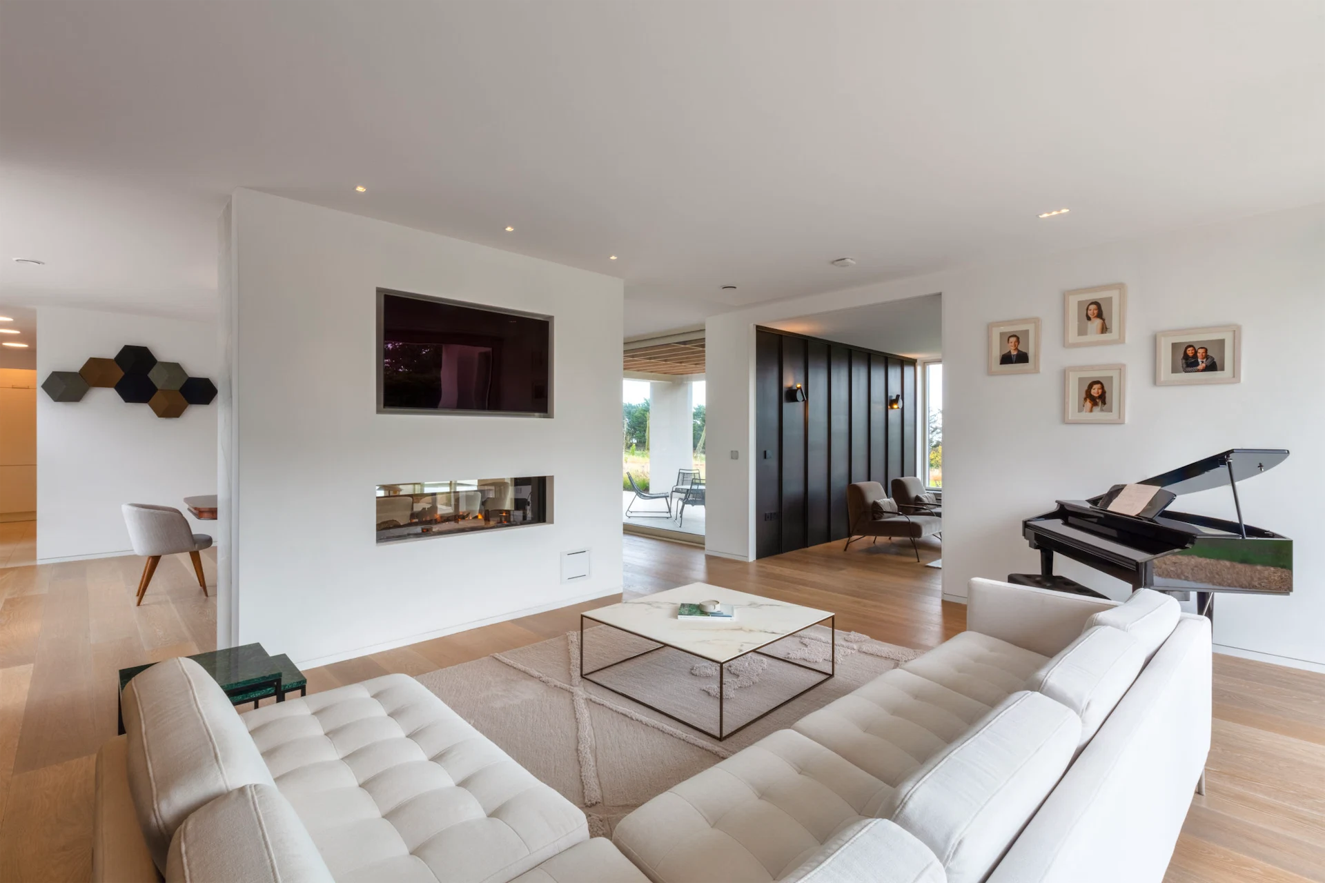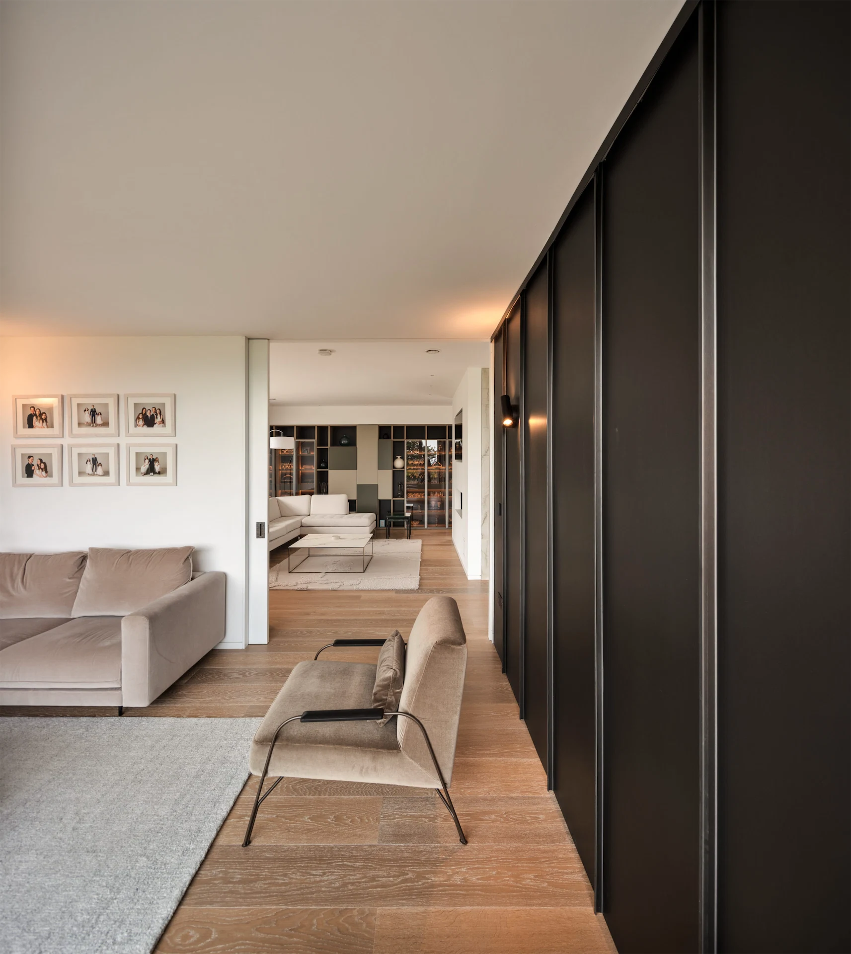 A smaller family room with sea views is located just off this open-plan space, with a large pocket door acting as a partition. As Paul puts it, the door was the subject of “healthy debate” during the build. “My initial reaction was that it should remain open but as we find on house projects, several family functions come into play.” The family needed a cosy, quieter space to relax in, yet when the door is thrown open it appears very much a part of the rest of the space. A zinc wall here links the house with the linear exterior wall that runs along the drive and gives the space warmth.