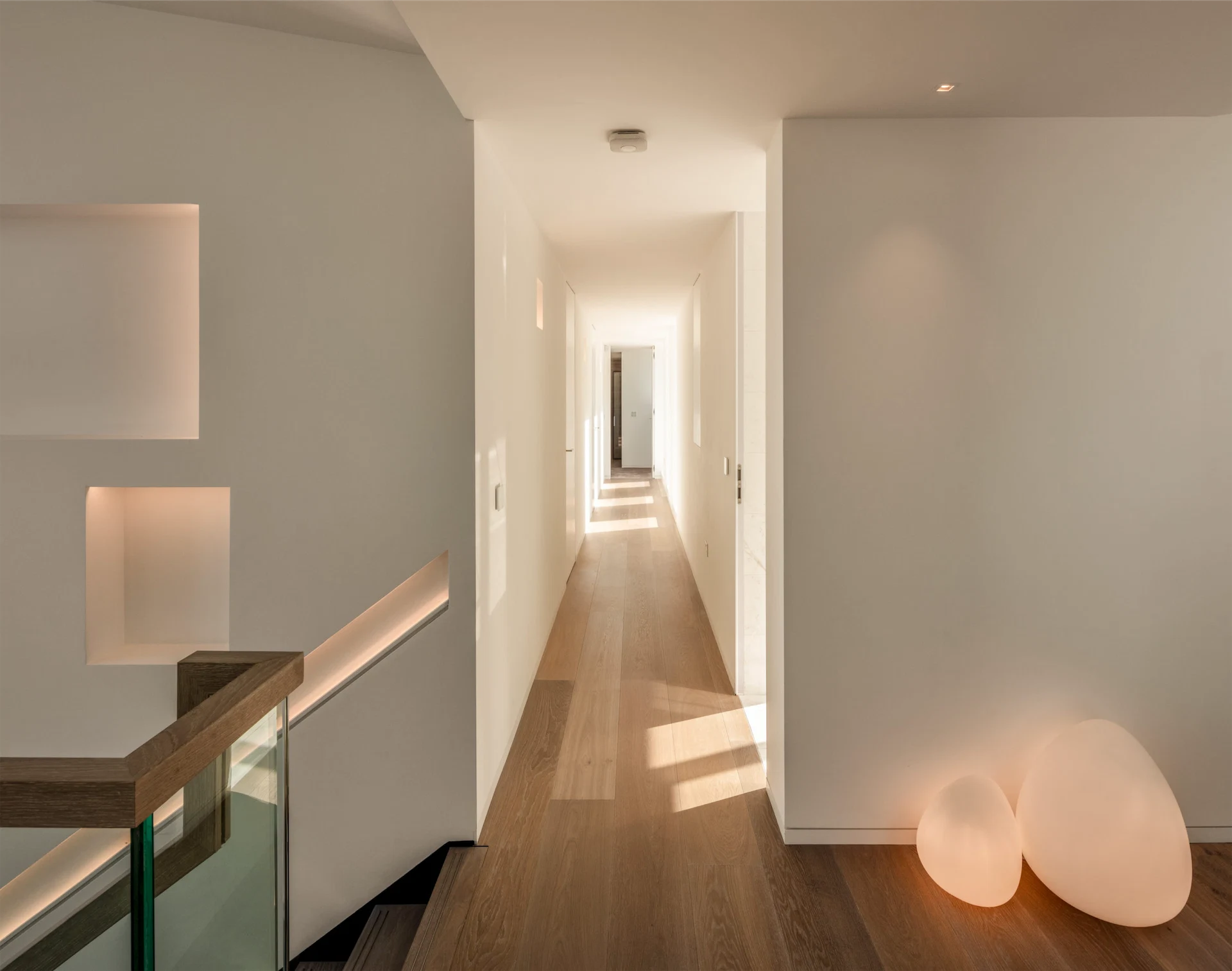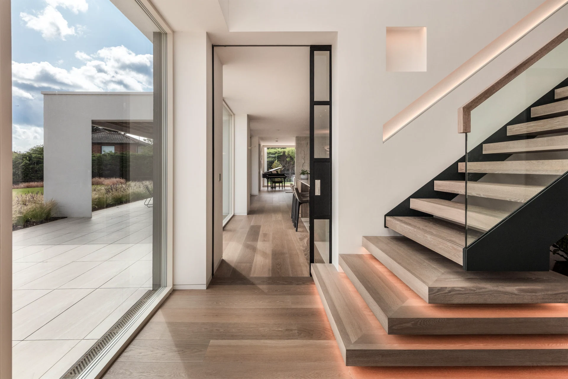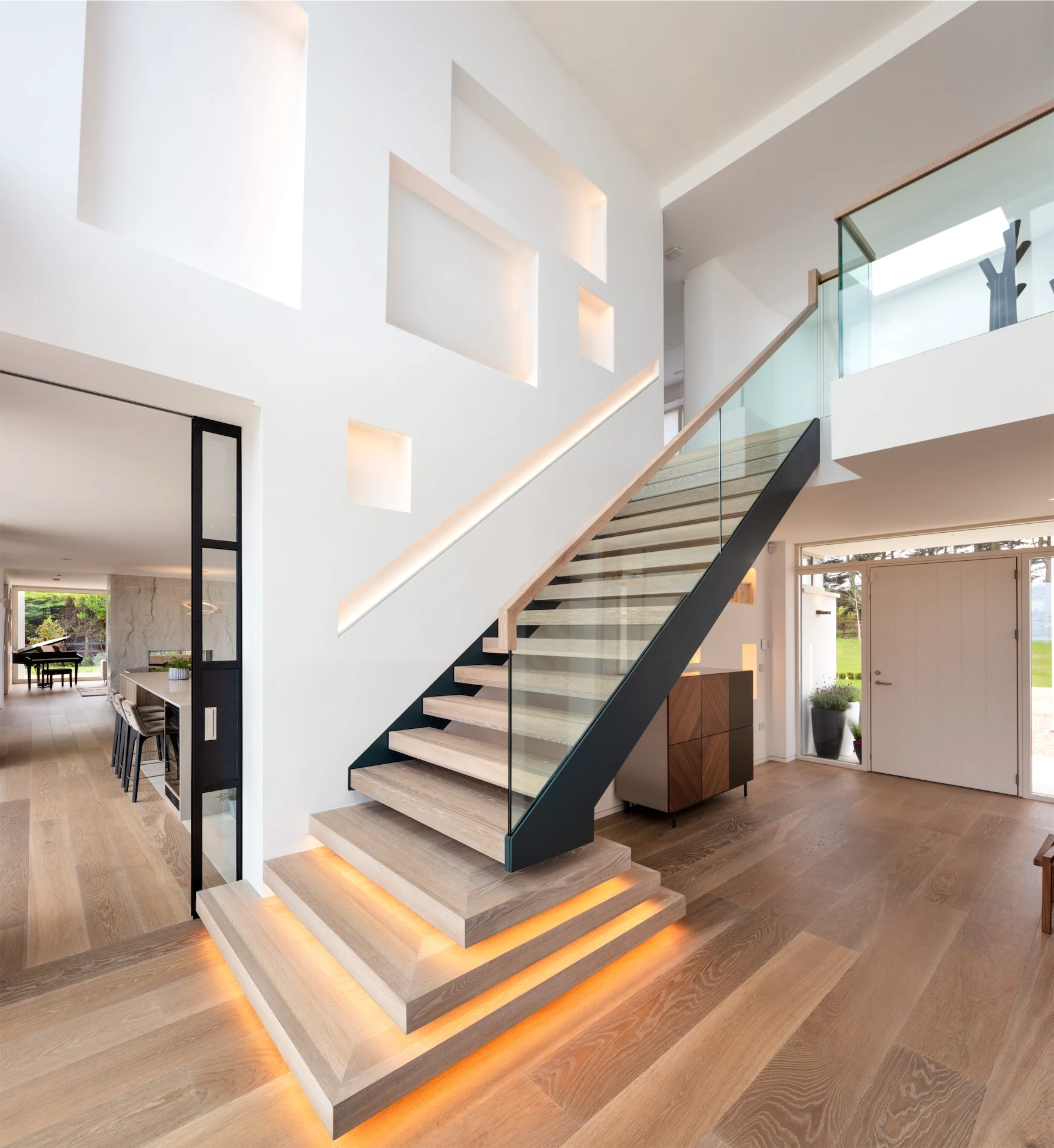 Internally, Alan and Shirley wanted an open-plan space that felt bright and airy, but could also be flexible and allow for more intimate spaces. Coming into the vaulted hallway with its cantilever staircase, glass Crittall sliding doors allow it to be shared with the communal spaces or sealed off, yet always maintaining a visual link from one end of the house to the other. “The openings are non-standard too,” says Paul, “they are high and wide to give a more open-plan feel but at the same time are partitioned off when needed.”