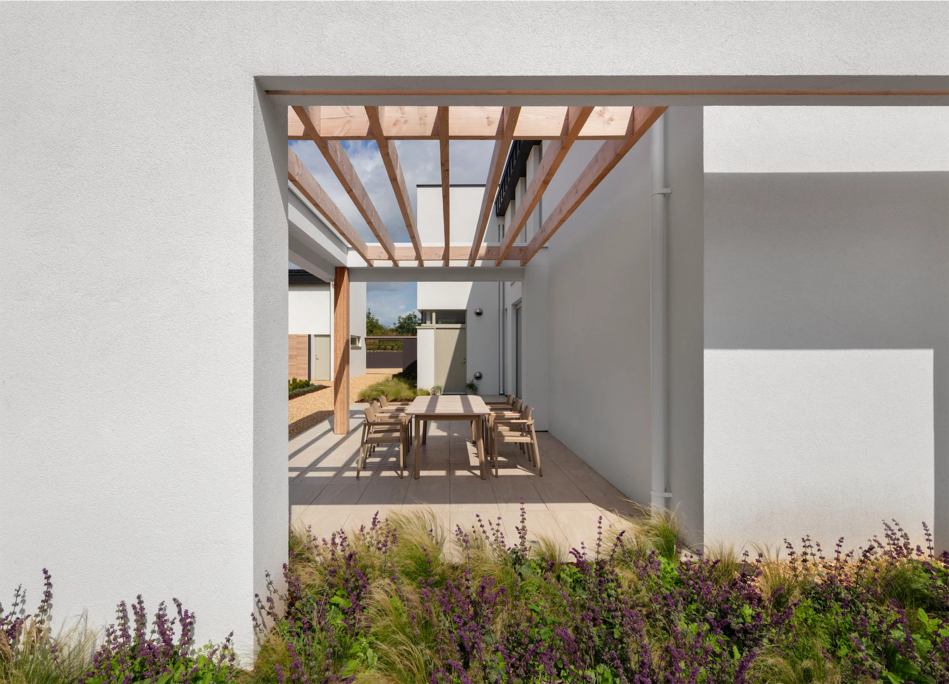 To capture the evening sun, they placed another small westerly courtyard to the rear of the house. Both of these patios are accessed through the kitchen via glass sliding doors which also act as a link between the house and its views. “When you’re enjoying the evening sun, you can look through the house towards the sea view,” explains Paul. “You are always in touch with the view.”