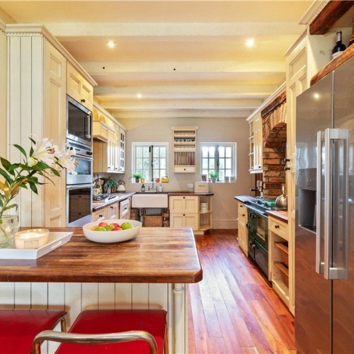 During recent renovations, a new large integrative utility block was added to the north side, serving all of the primary spaces in the house. The kitchen/dining room was moved to the south-facing single-storey section of the house, creating a stronger connection between the house and the garden as well as providing an excellent space for family dining and entertaining.