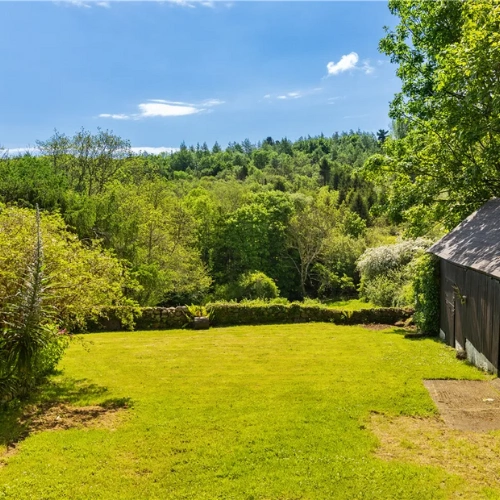 Surrounded by green fields and with a stream and a small pond nearby, the cottage is a haven of peace and tranquillity. To the eastern part of the garden, a hedge conceals an additional garden space which accommodates the glass house, the fruit garden and vegetable patch. To the western side, lies the haggard with a long stable building along with a spacious detached garage and a separate boiler house.