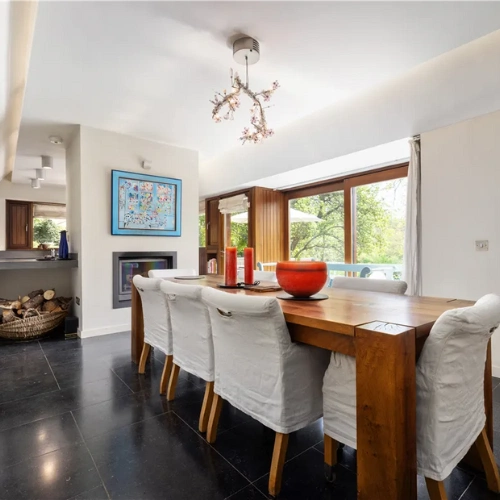 Inside, the accommodation comprises an open plan kitchen, living, dining area and impressive sitting room – all featuring stunning ceiling-to-floor sliding doors, which each open onto the large patios of the south-facing garden – along with four generously proportioned bedrooms and four bathrooms.