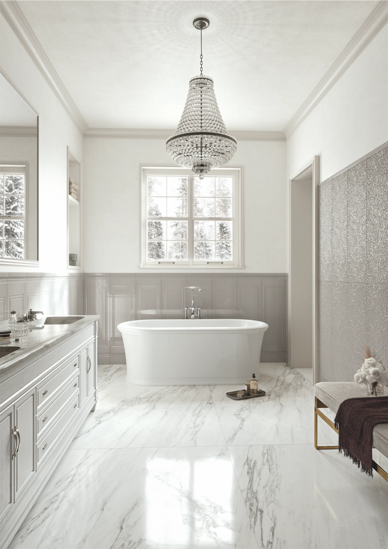 The elevated features are the real heroes of this room though. The marble tile (and the chandelier) add elegance and texture to the sleek space, while the sweeping pattern adds movement and breaks up the solid colours that surround it.