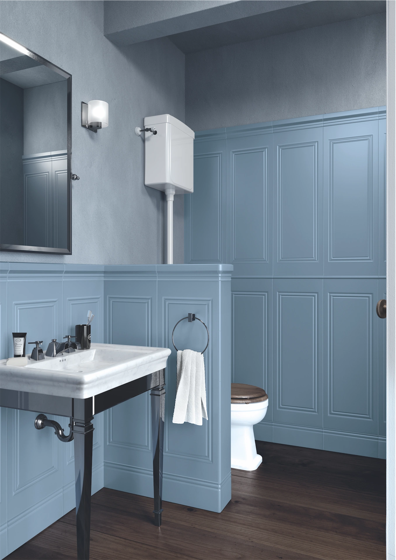 The above design features a soothing blue hue on both the tiles and the wall colours. Not only does this conjure a relaxing energy, but it also looks beautiful. The trick here is to go for different patterns and textures to add depth to the space, like how the wall tiles feature a rectangular pattern that contrast with the smooth walls and the striated, dark wood flooring.