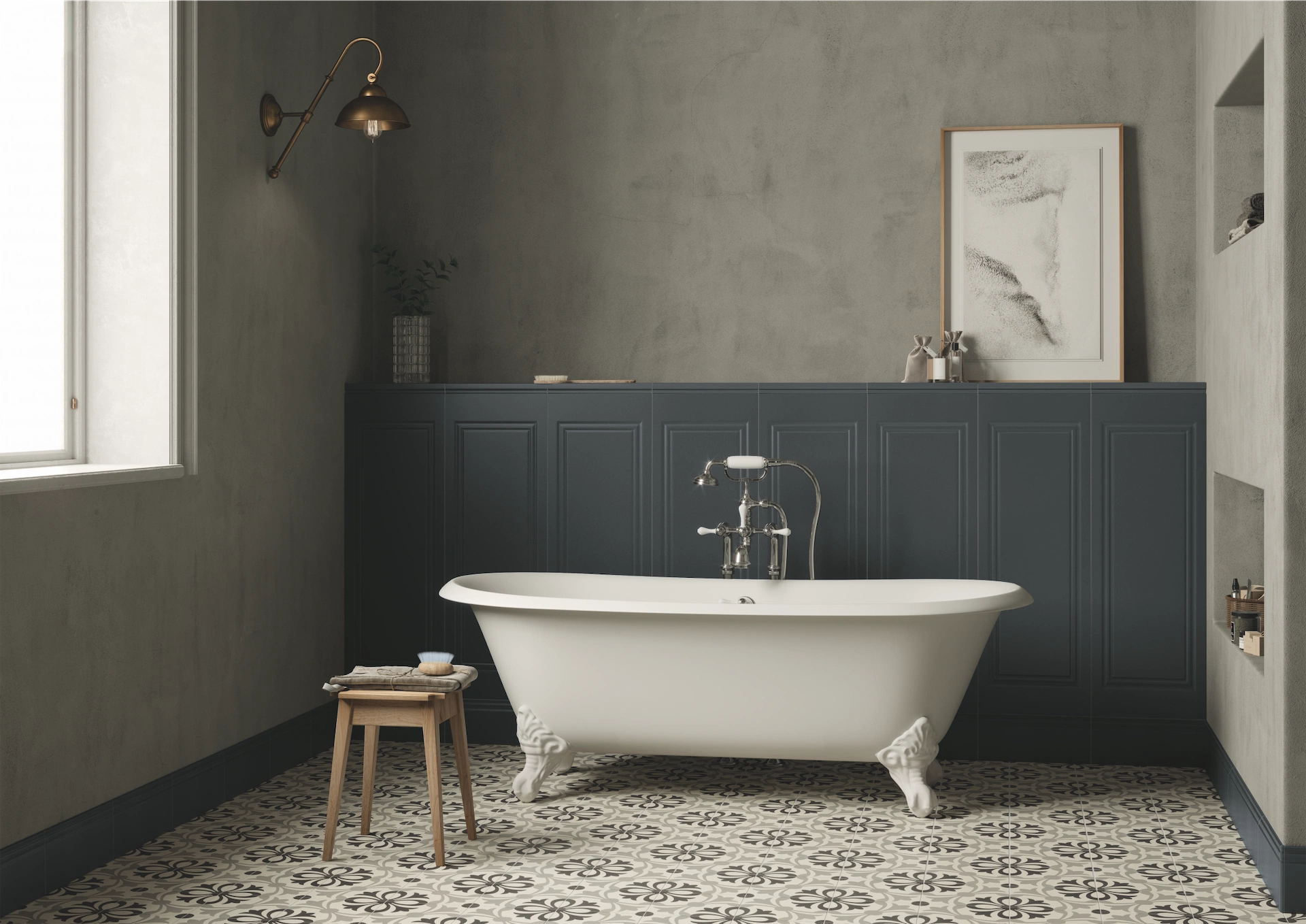 For example, the above design is fashioned around intricately patterned floor tiles, and the white Victorian-style tub, dark gray panels and smoky walls all complement that initial pattern.
