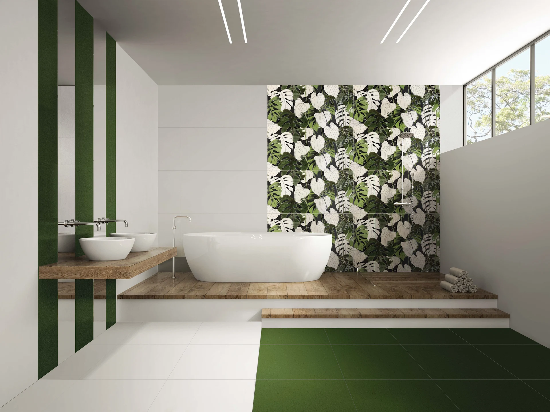 We particularly love this striking green tile with a varied leaf pattern. It breathes new life into the shower space and is strategically balanced by the mirrored stripes behind the sinks and matching floor below.