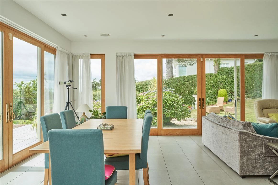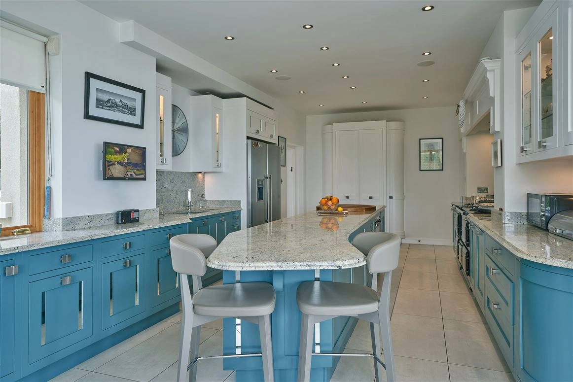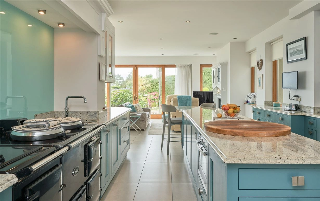 Glazed panels installed in the modern integrated kitchen open to an extensive decked area with glazed panelled borders, having the effect of drawing the exceptional views into the heart of the home. This view must be experienced in order to fully appreciate just how special this particular setting is. It is hypnotic by day, and equally so by night.