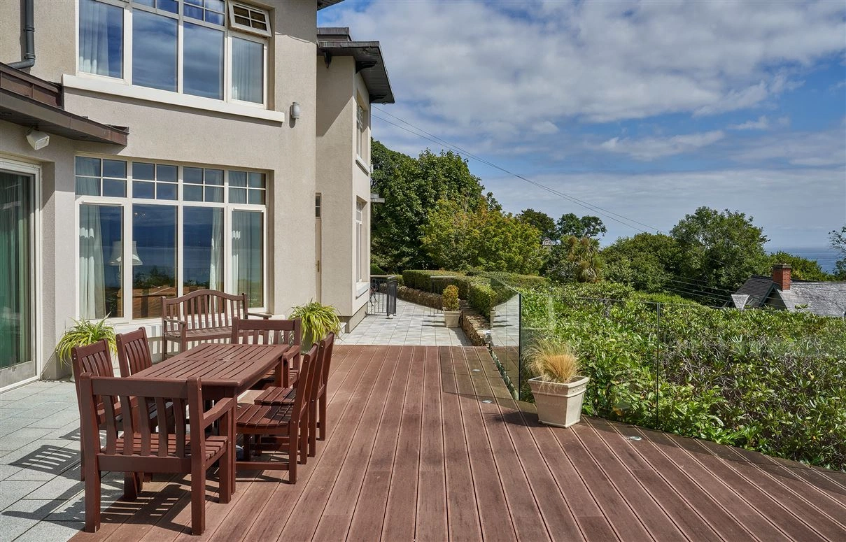 The large granite and decked patio area enjoys the most magnificent views over the southern slopes of the peninsula across Dublin Bay. There are several storage units and sheds.
