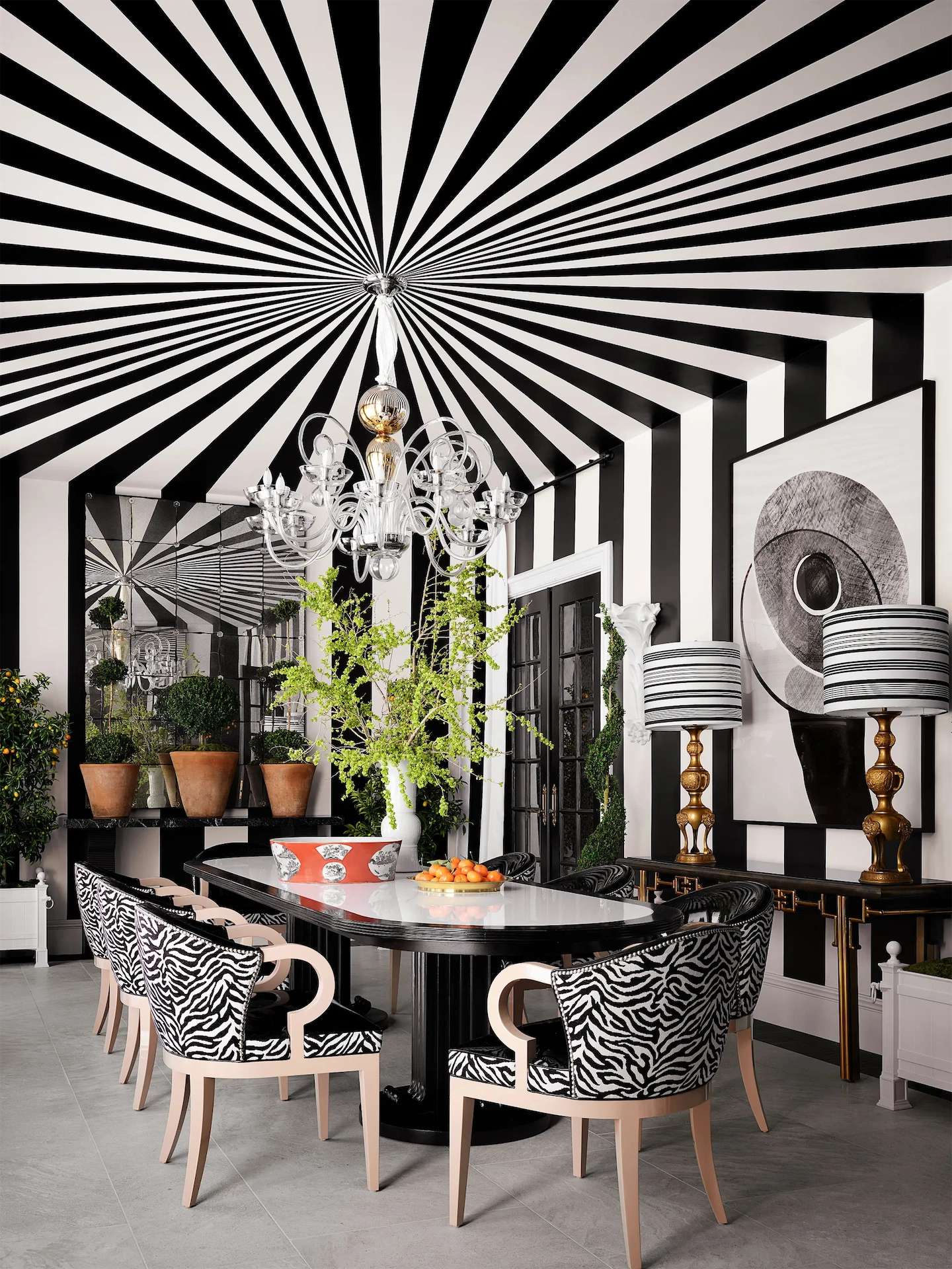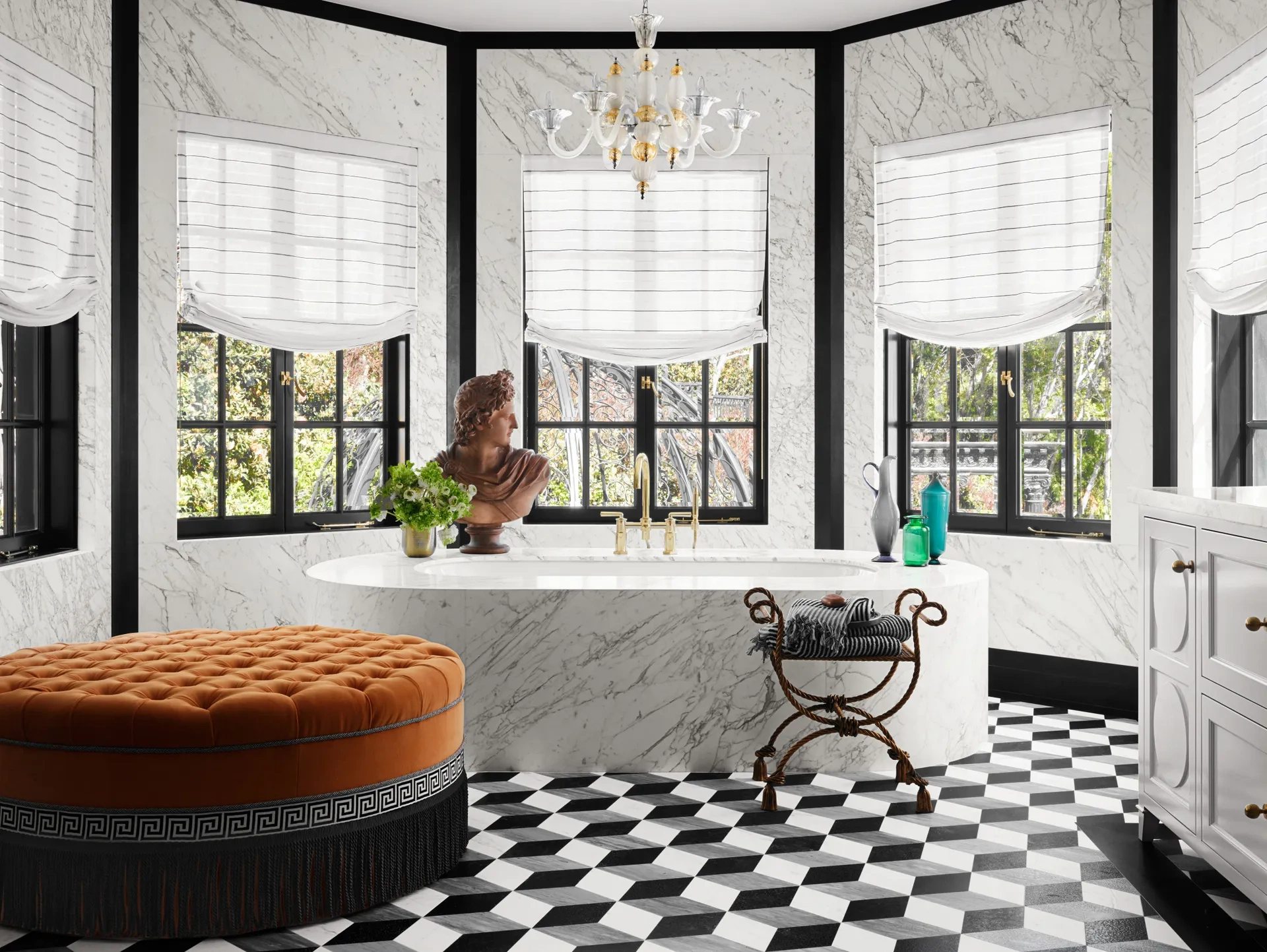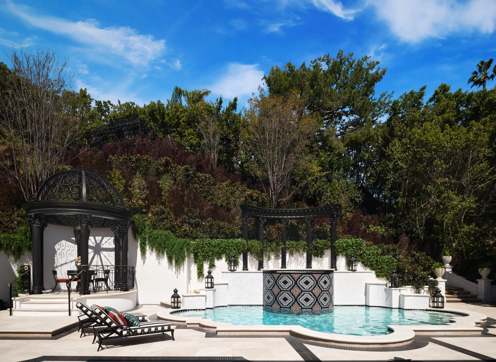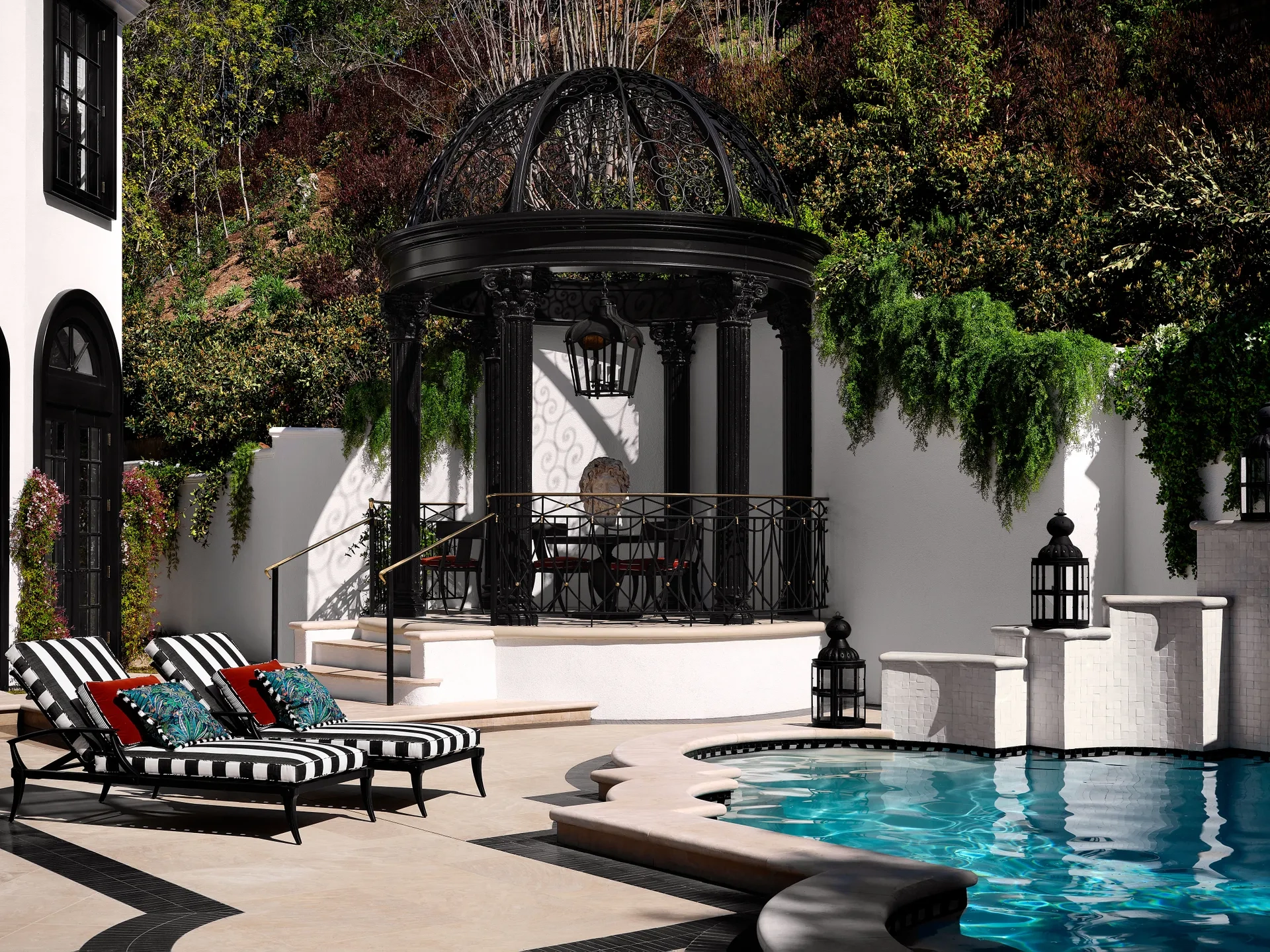 Outside, landscape architect James Hyatt worked his magic, mirroring the same neoclassical motifs that adorn the inside and adding a graphic zellige-tiled spa and some drought-tolerant plants. “We were going to do more planting on the pool terrace, but Ru wanted to be able to roller-skate and dance. We tried to capture the sense of joy he exudes,” says Hyatt.