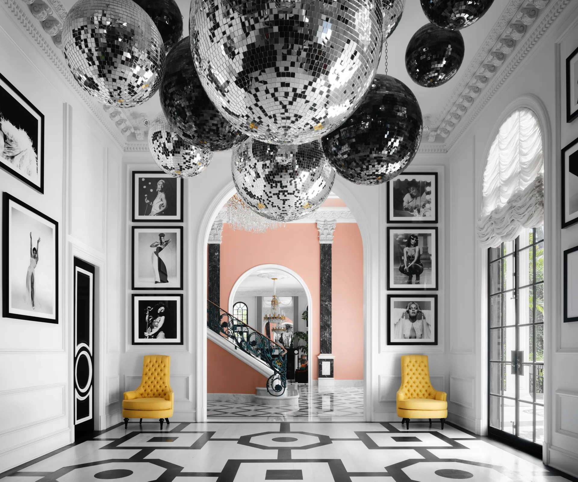 A powdery rose entrance hall with a sweeping staircase opens onto the formal living room, outfitted with “jewel-toned fabrics and pagoda-form e?tage?res that nod to the great decorator Tony Duquette”. To the left is the ballroom, a focal point of the home with standout features including a dazzling display of disco balls (26, to be exact) and a selection of black and white framed photographs of RuPaul’s favourite divas.