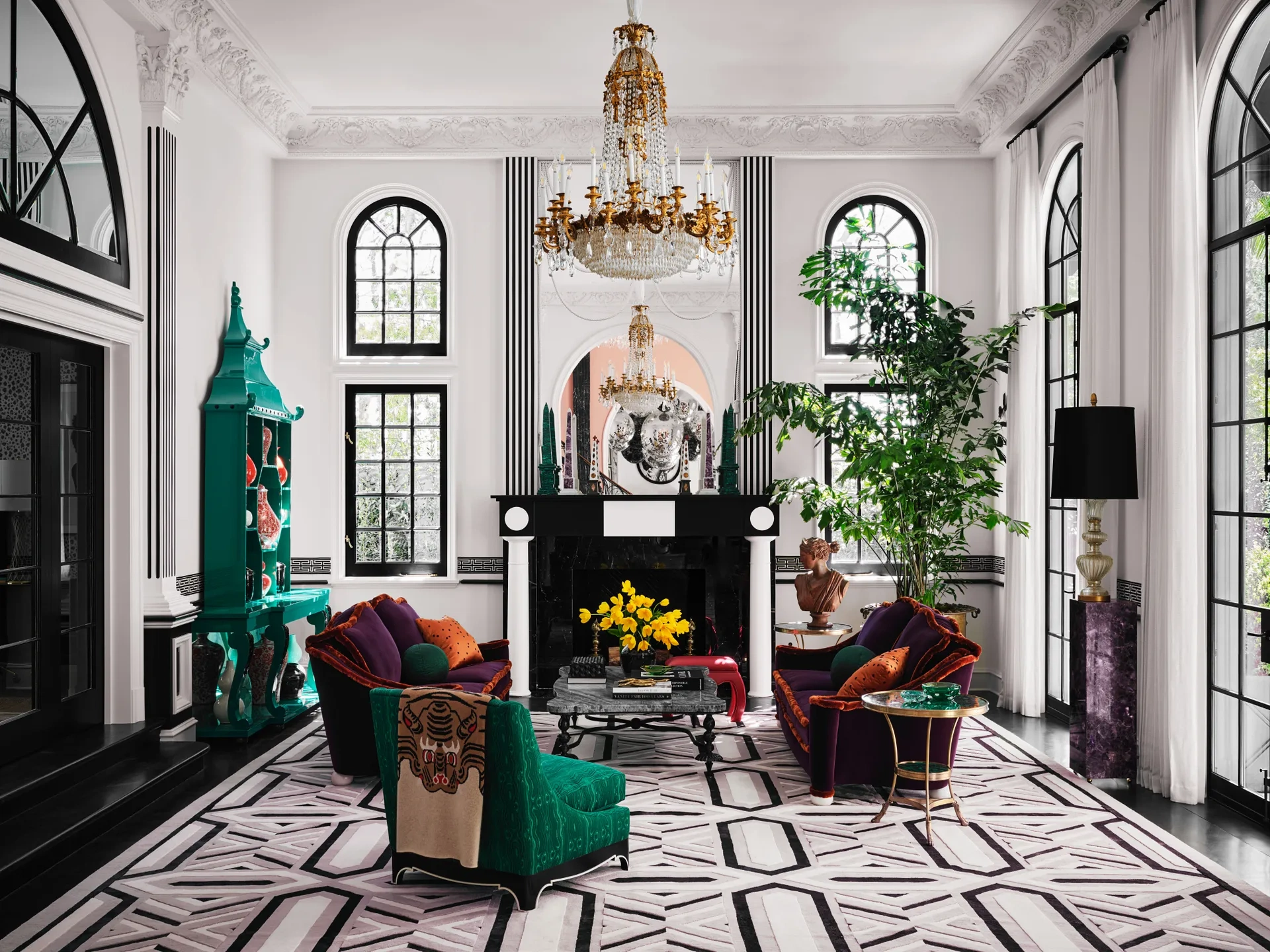 The physical structure of the building was the first job to be tackled; modifications were made to the existing mansard roof, railings and colonnades were reconfigured, and a host of neoclassical details were added. After that, it was all about the “decorative drama”. As AD put it, “The slay bells start ringing the moment one steps through the front door”.