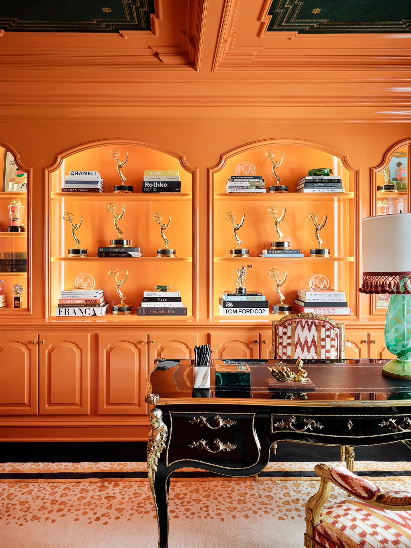 That said, beautiful nooks in which to entertain guests abound, ranging from an outdoor dining room bordered by fruit trees, topiaries and chairs in the style of Elsie de Wolfe to the kitchen with its marble-topped island. Splashes of orange (RuPaul’s favourite colour) permeate the entire home – seen in the kitchen, the adjacent breakfast room, the performer’s home office and the “ultraluxe” master bedroom.