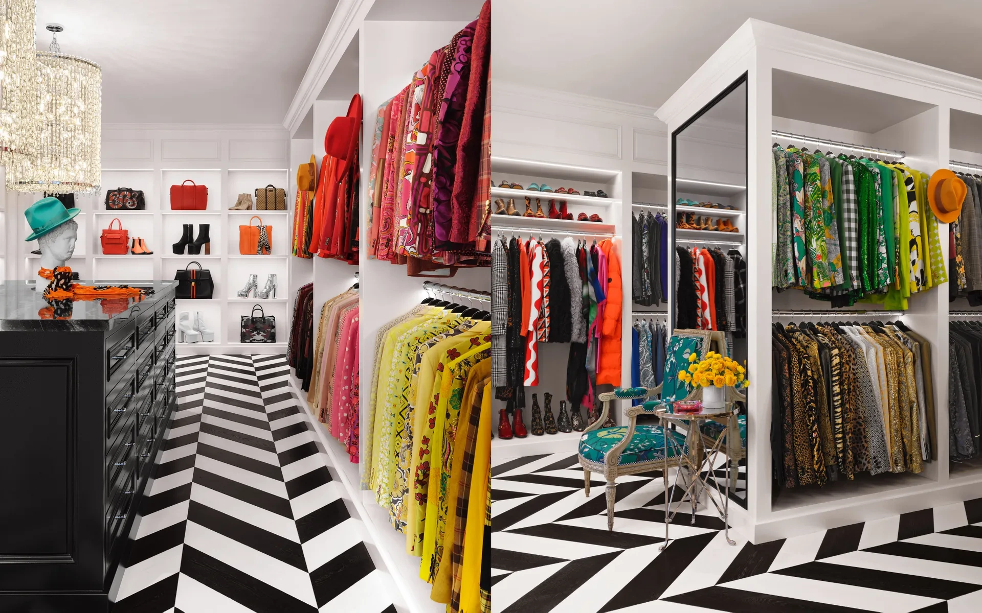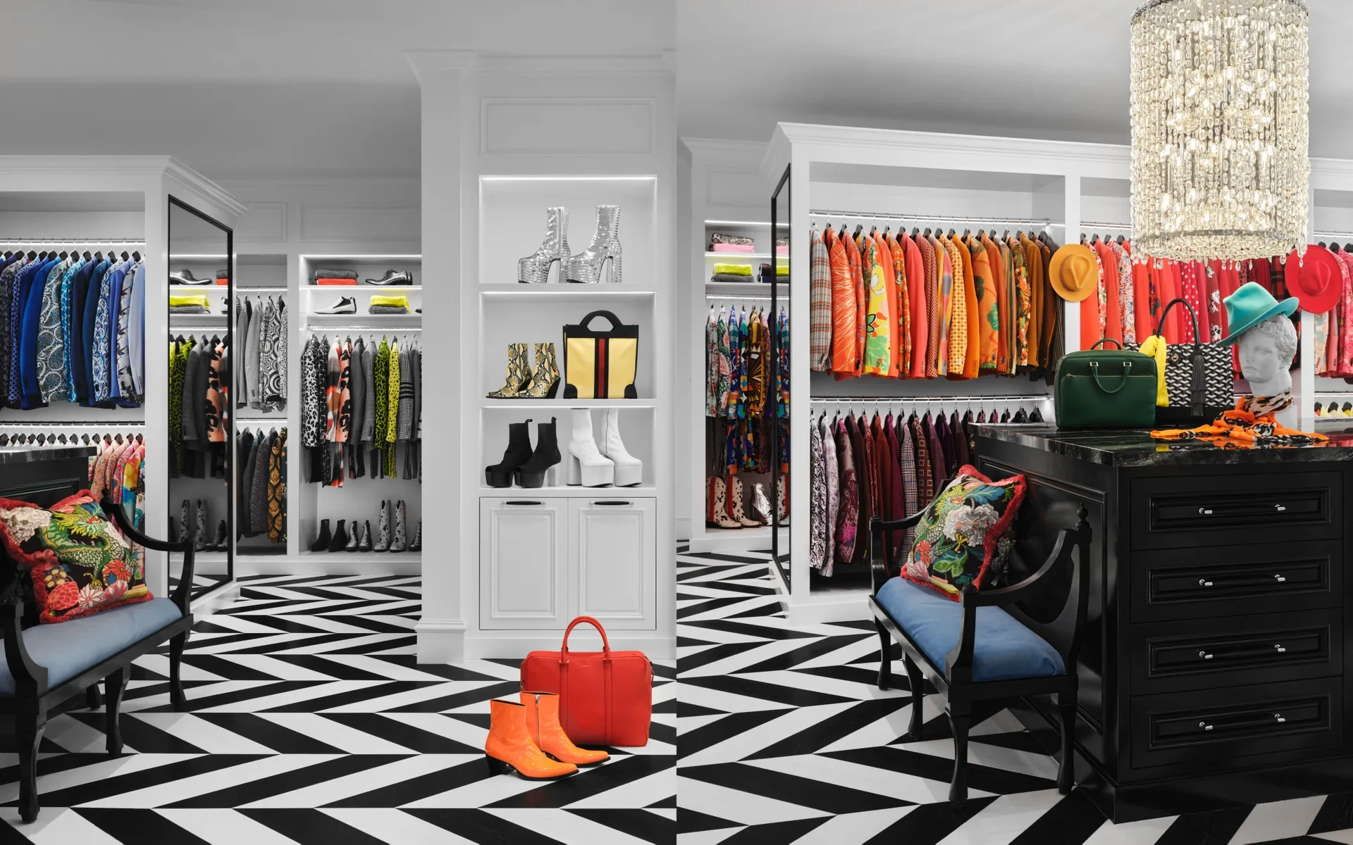 According to Bullard, “The bedroom is very glam, very romantic, but in a weird way it still has some masculinity to it. Two enormous walk-in wardrobes – one for male attire, the other for drag – house the TV personality’s enviably large collection of clothes, accessories and shoes. “It feels like you’re skipping into Bergdorf’s, the chicest boutique you could dream of,” RuPaul says of the space.