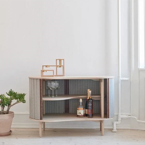 Put all your pretty-enough-to-display pieces on the shelves but hide necessary evils in low-down cupboards. This unit is set up as a drinks cabinet but it would make an equally great linen closet in a bedroom or tableware storage in the dining area. The tweed fabric glides shut while the oak frame makes it seem sturdy yet light.
