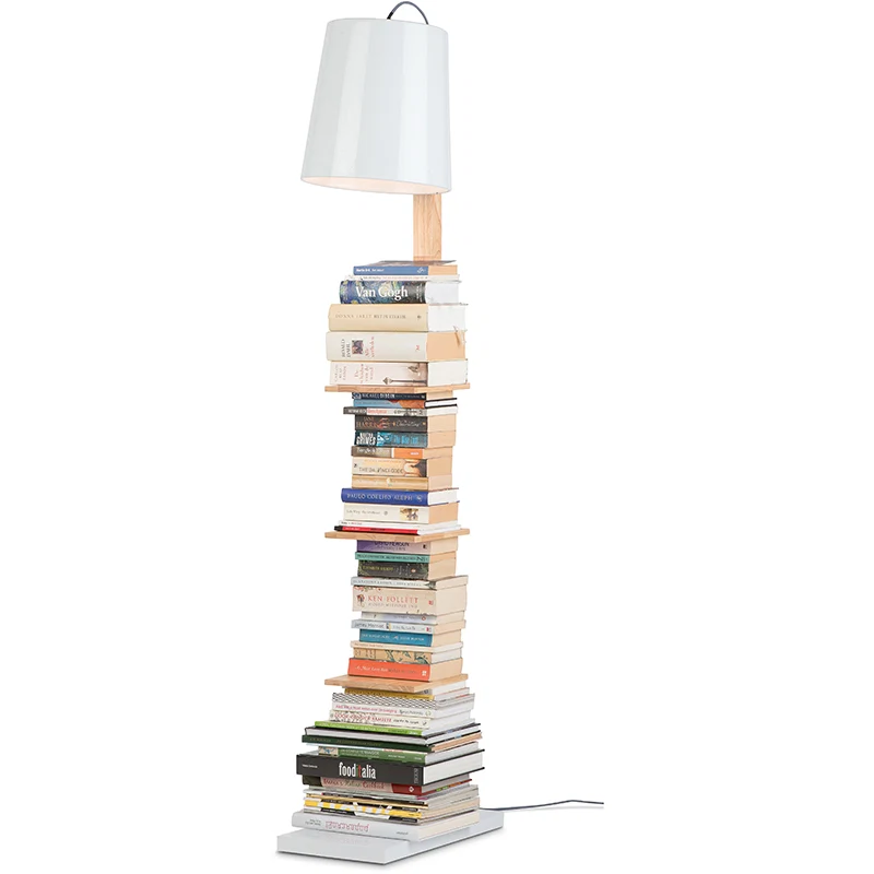 Small homes need to be as multi-functional as possible. This floor light keeps the lighting low, highlights your books and creates a designated reading area, and also acts as storage. Win win win.