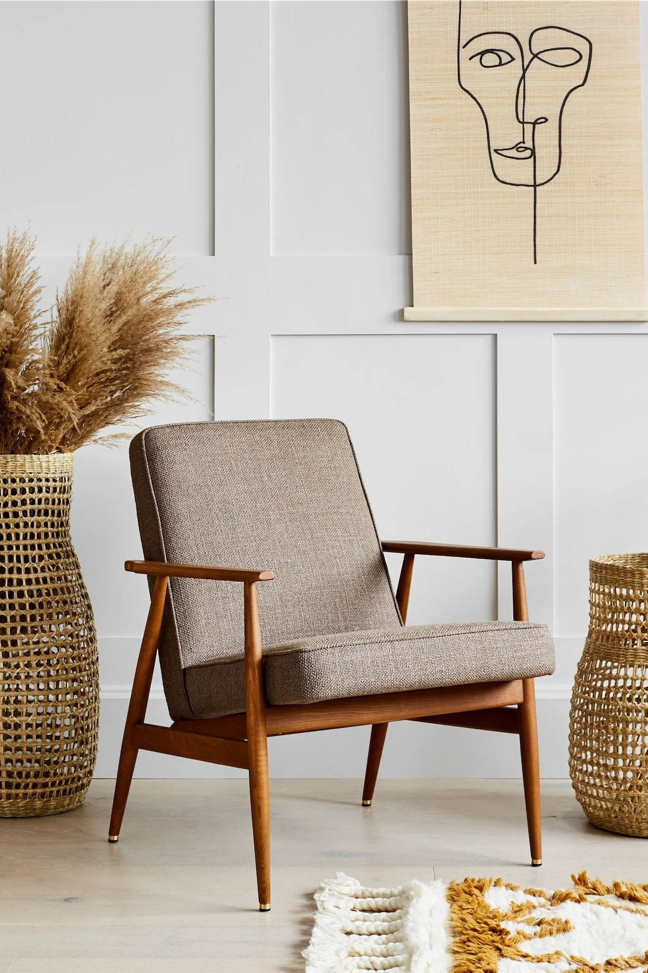 Invest in an open lounge chair like this one, that doesn’t suck up all the light and looks as pretty from the back as it does from the front, thanks to those gorgeous mid-century modern inspired legs and twany tweed fabric.