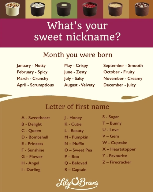 Alongside discovering the most common nicknames for you or your loved one, Lily O’Brien’s has also created a nickname generator, inspired by the delicious recipes in the Desserts Collection. To test it out and generate your nickname, all you have to do is find the name for your birth month, then the name for the first letter of your name, put the two together and that’s the nickname!