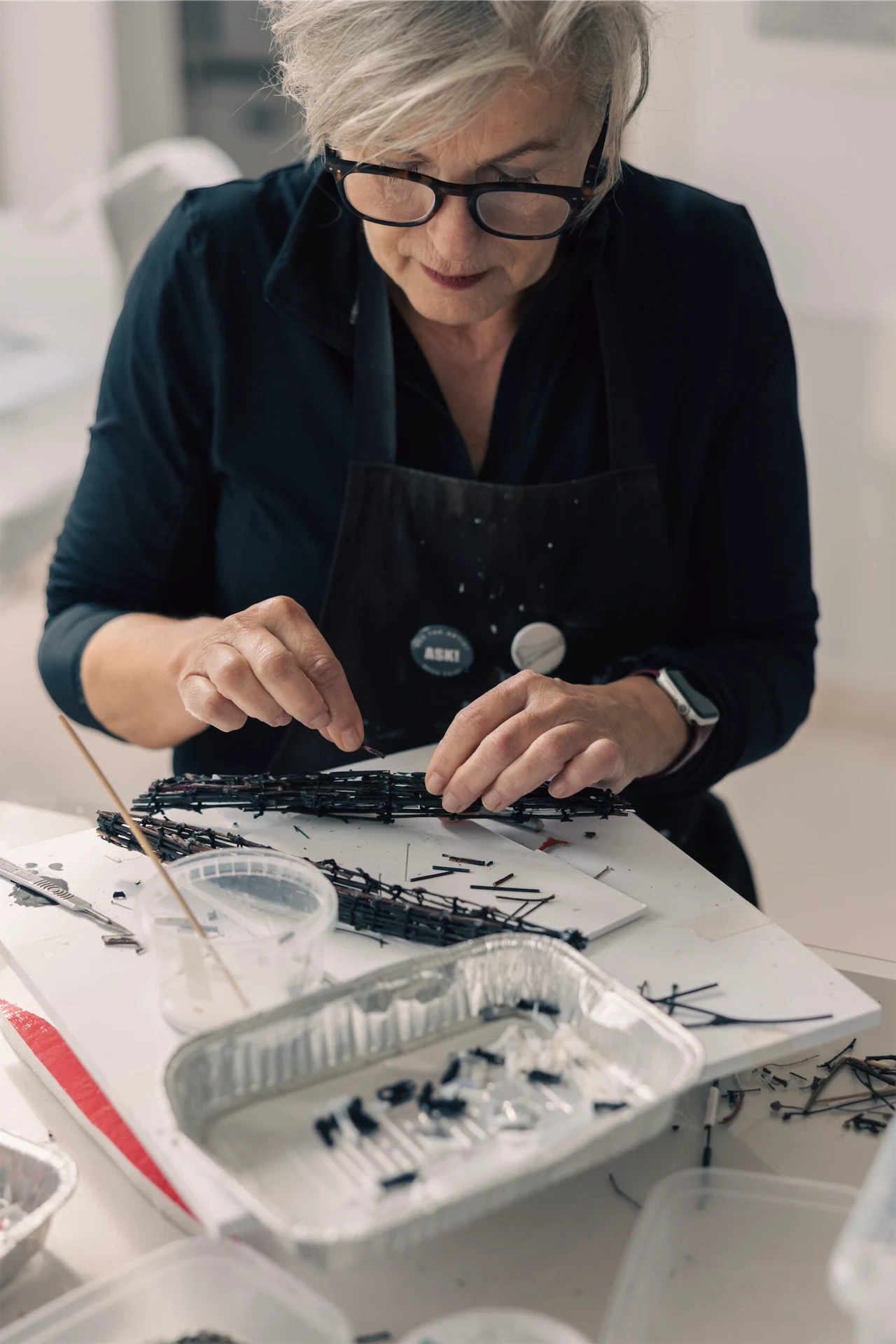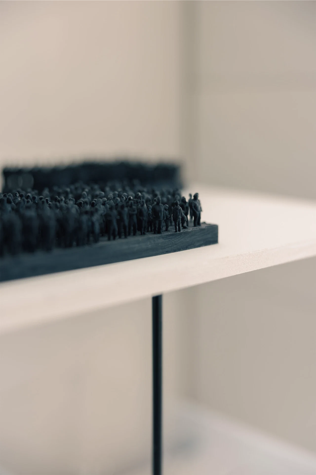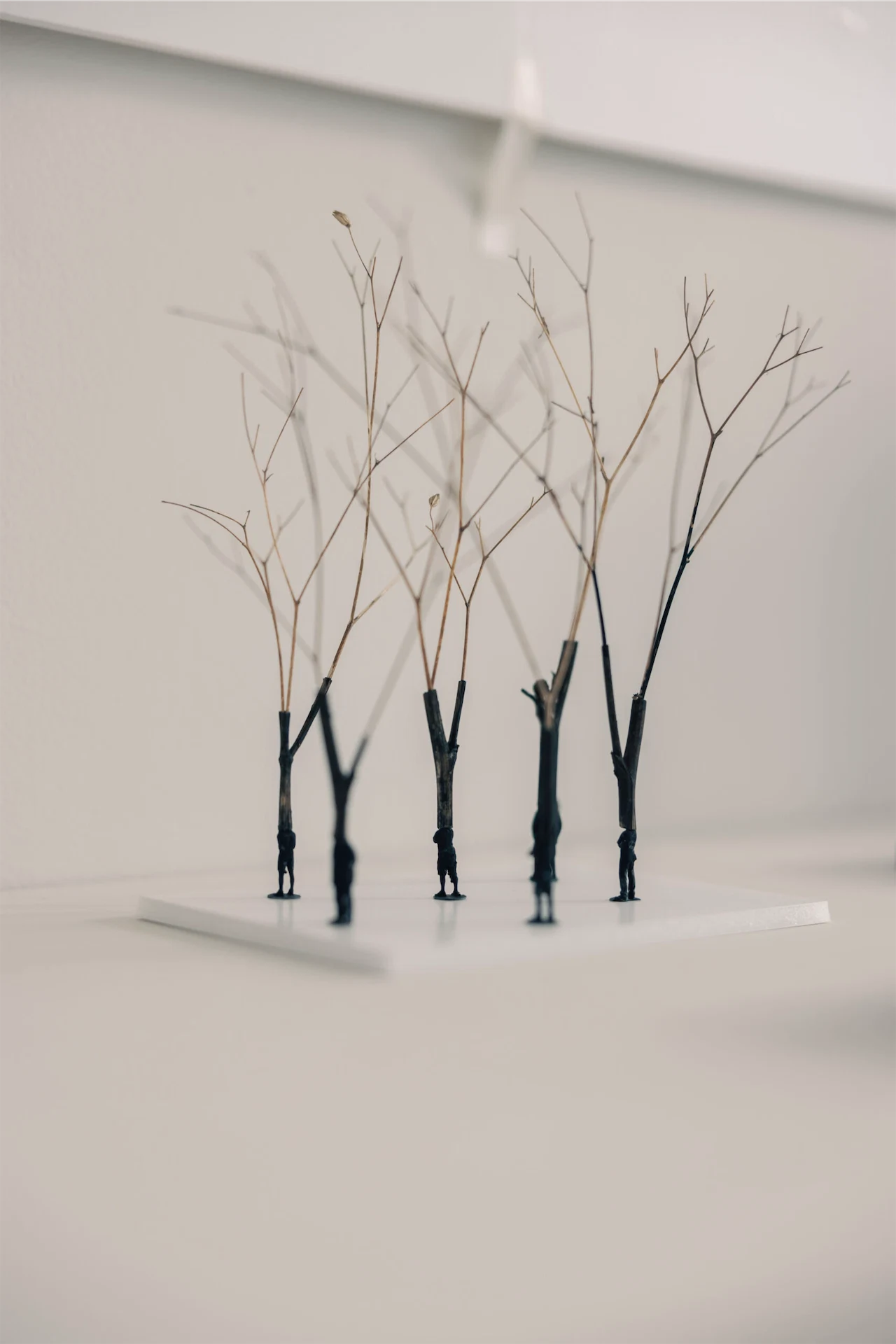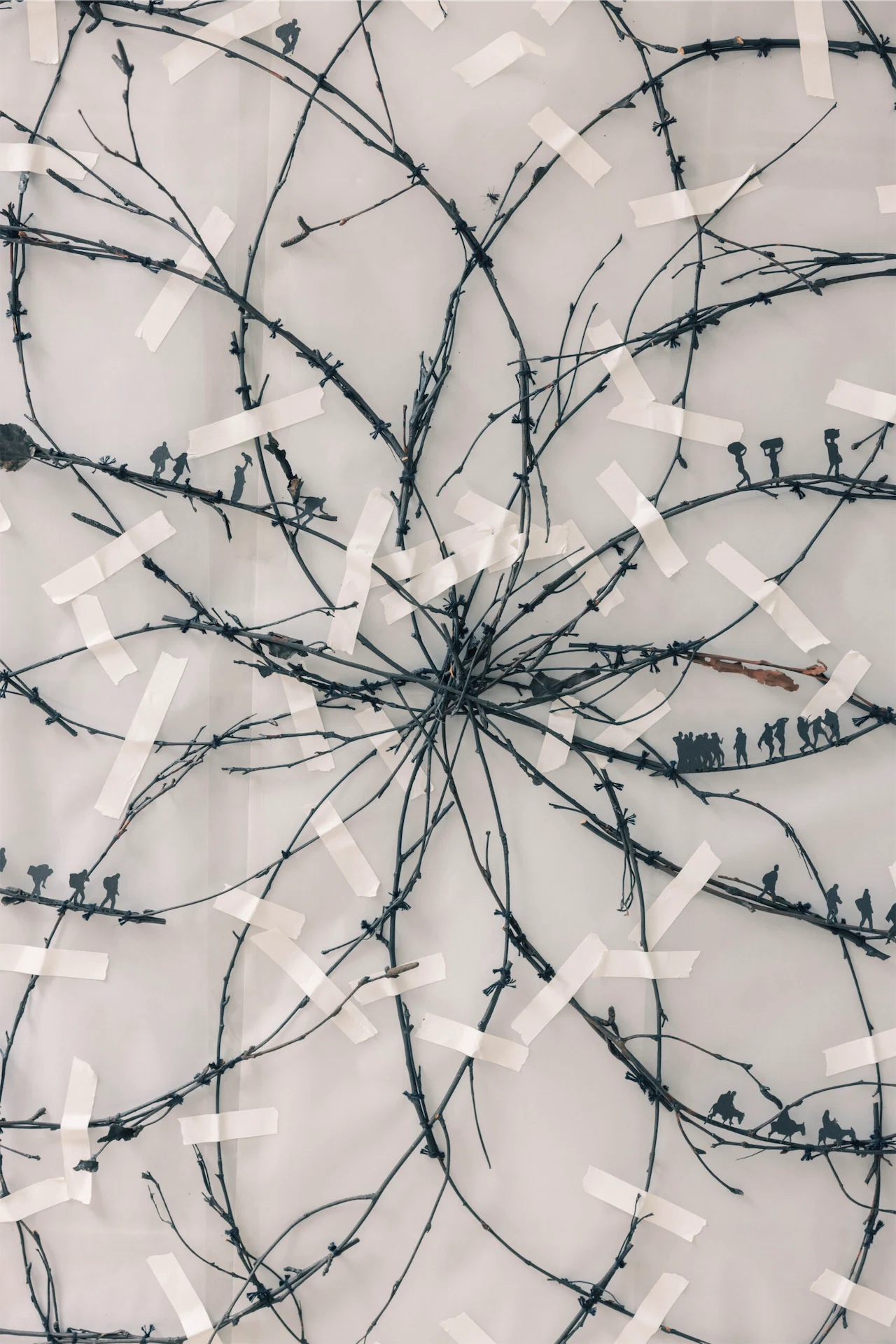 Groener wanted the work to appear abstract from a distance “because we can’t fathom what is going on” when people are displaced by war. Balancing the silhouettes along delicate twigs also challenges viewers’ perspective. “They disappear when you stand in front of them and you see them as you move. It’s a play on you deciding if you want to see them or not.”