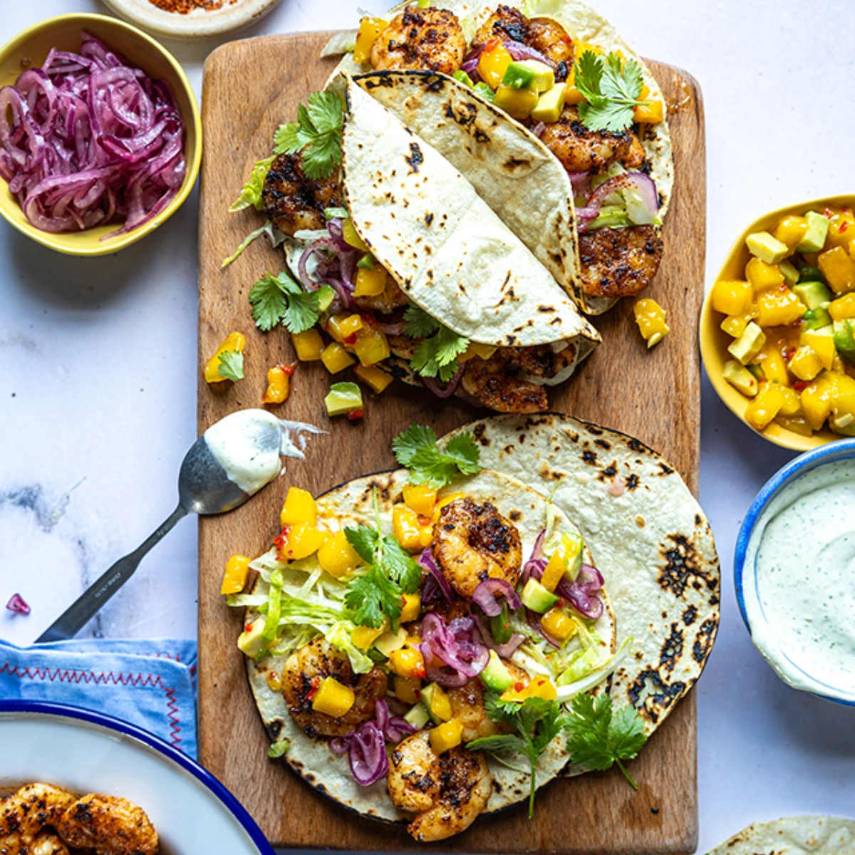 Griddled blackened prawn tacos with mango salsa, pickled red onion and coriander lime crema