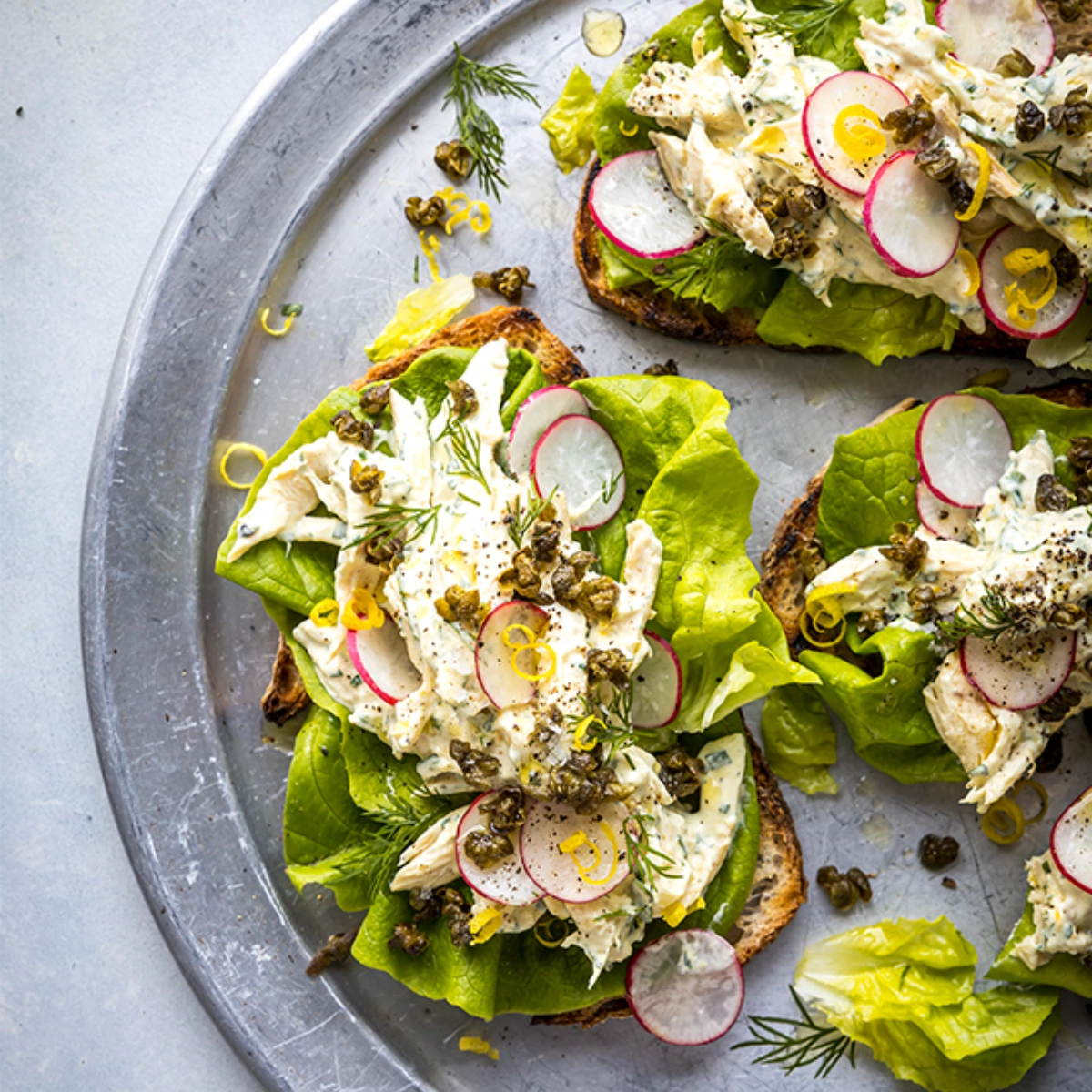 A classic sandwich topper and an old reliable particularly if you have leftover chicken is chicken salad tartines – Dijon mustard, mayo and plenty of herbs and lemon juice provide a great pep to any cooked chicken and throw in capers and cornichons if you want crunch and saltiness. Spread it generously on toast and you have lunch! – Donal Skehan