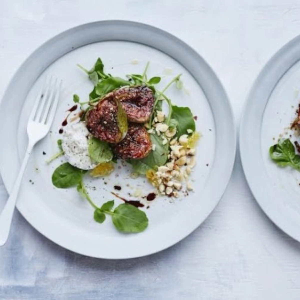- Arrange the land cress on each plate, along with the roasted figs, chopped hazelnuts and goat’s cheese. Break the honeycomb into small chunks all over the salad (this is a bit messy but I quite enjoy it!) and finish with a drizzle of the remaining balsamic vinegar and olive oil. Season with a generous pinch of celery salt and freshly ground black pepper.
