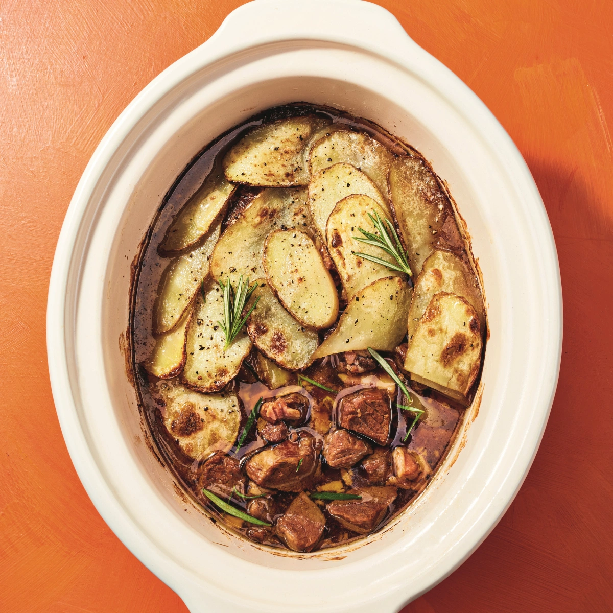 six to seven hours. - For the last hour and a half of cooking, add two heaped tablespoons of cornflour blended with two tablespoons of water to the slow cooker and mix in. Then layer the thinly sliced potatoes on top, season with black pepper and allow them to cook in the slow cooker.