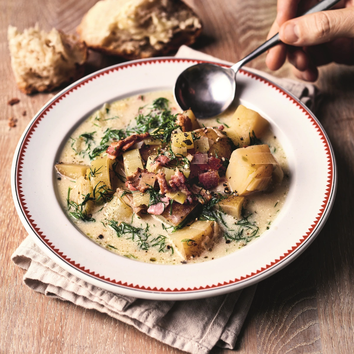 Potato and leek soup is one of my favourite soups, so this stripped-back, non-blitzed version with bacon is all you need on a cold day – or any day, for that matter. The chicken stock really packs in that flavour, so don’t swap it with water here. – Nathan Anthony