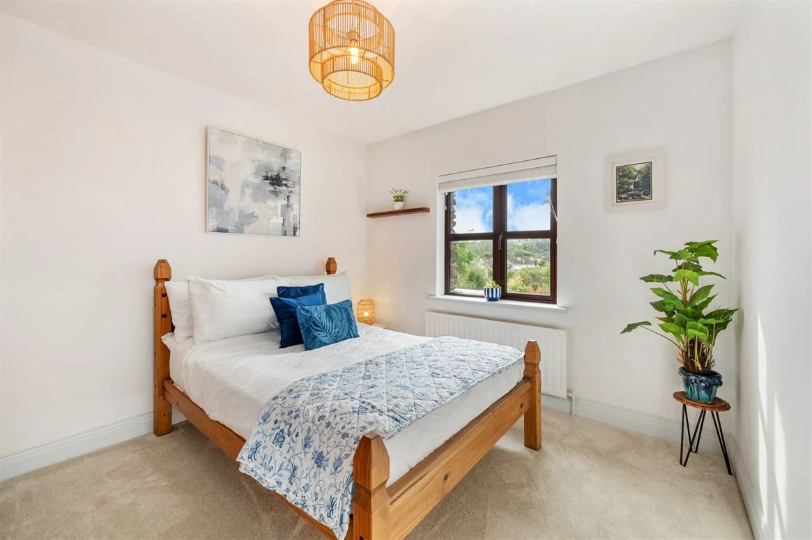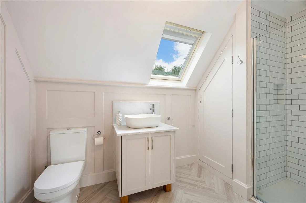 Upstairs, a light-filled landing with three Velux windows leads to three further double bedrooms. A bright and generous master bedroom is finished with carpet flooring and two charming window seats overlooking the village. A panelled feature wall behind the bed adds beautiful detailing and character. The room also benefits from a walk-in wardrobe with excellent storage and a private ensuite bathroom.