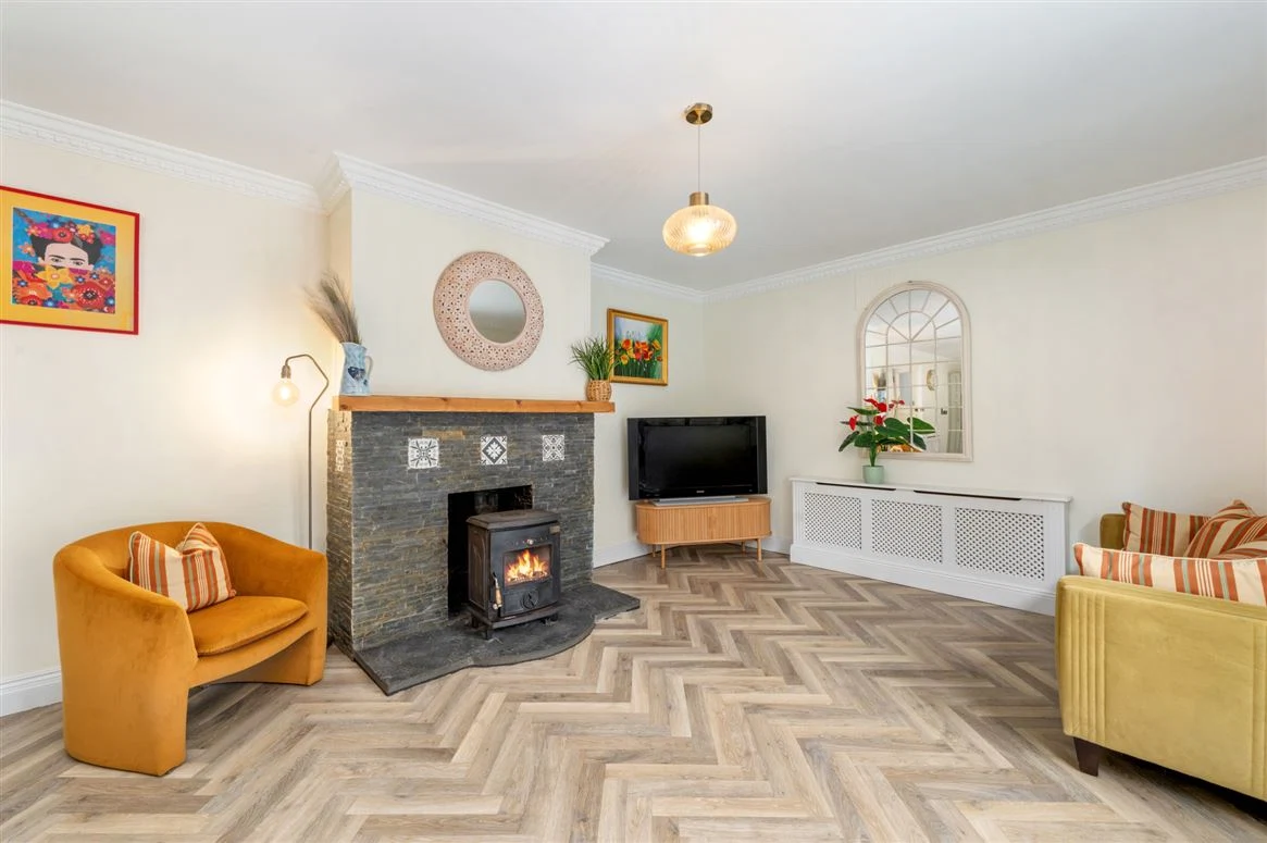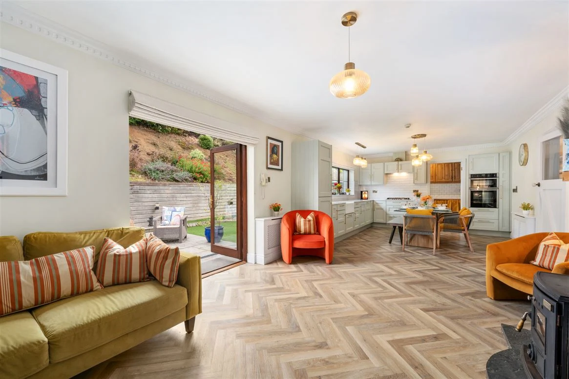 The living area centres around a stone fireplace with local Dripsey stone, a hardwood mantel, Liscannor stone hearth and a solid-fuel stove, creating a charming focal point. Decorative radiator covers enhance the finish, while French doors open onto the garden and patio, perfect for entertaining and enjoying outdoor living.