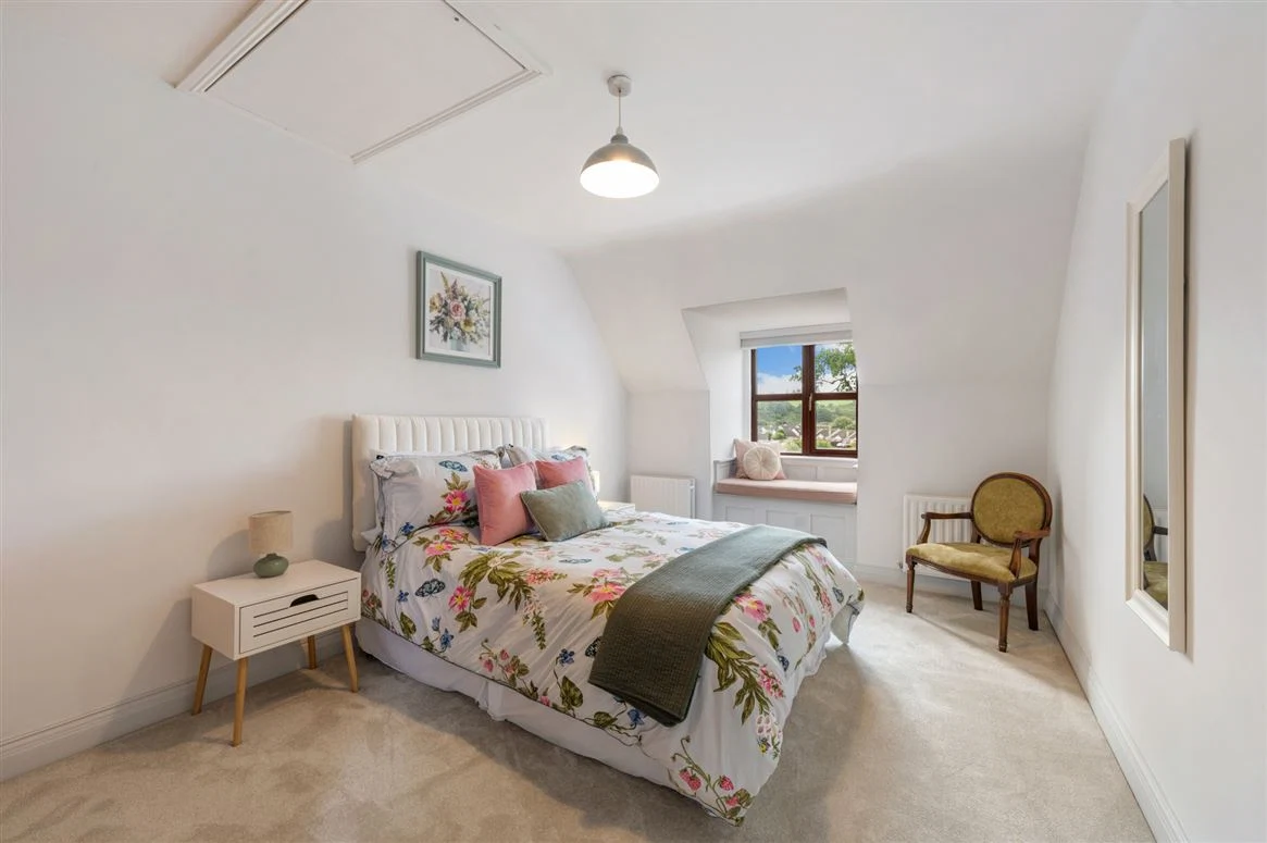 The three other bedrooms on this level offer charming window seats with lovely garden and village views. A spacious family bathroom completes the first floor, complete with a three-piece shower suite with a Triton electric shower, tiled walls and wood flooring throughout. A Velux window brings in natural light.