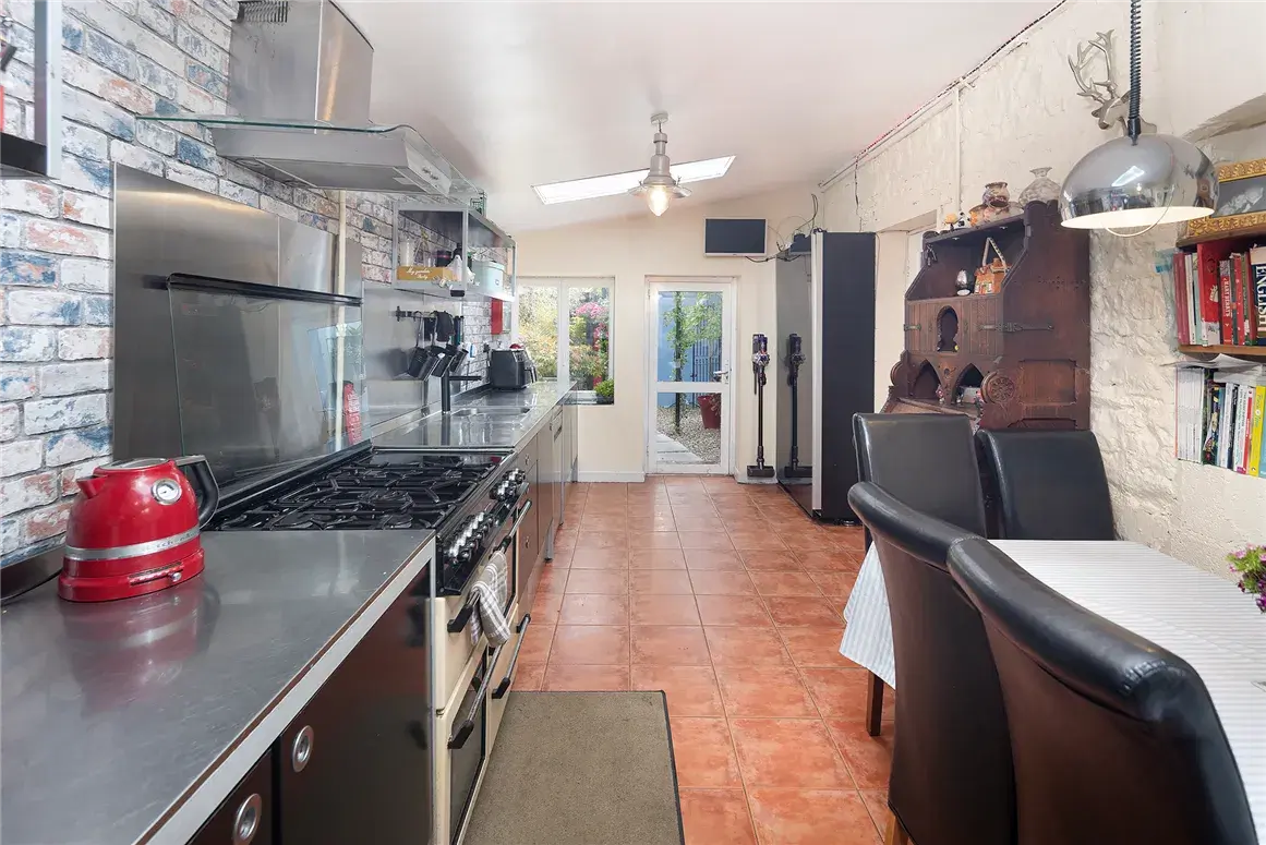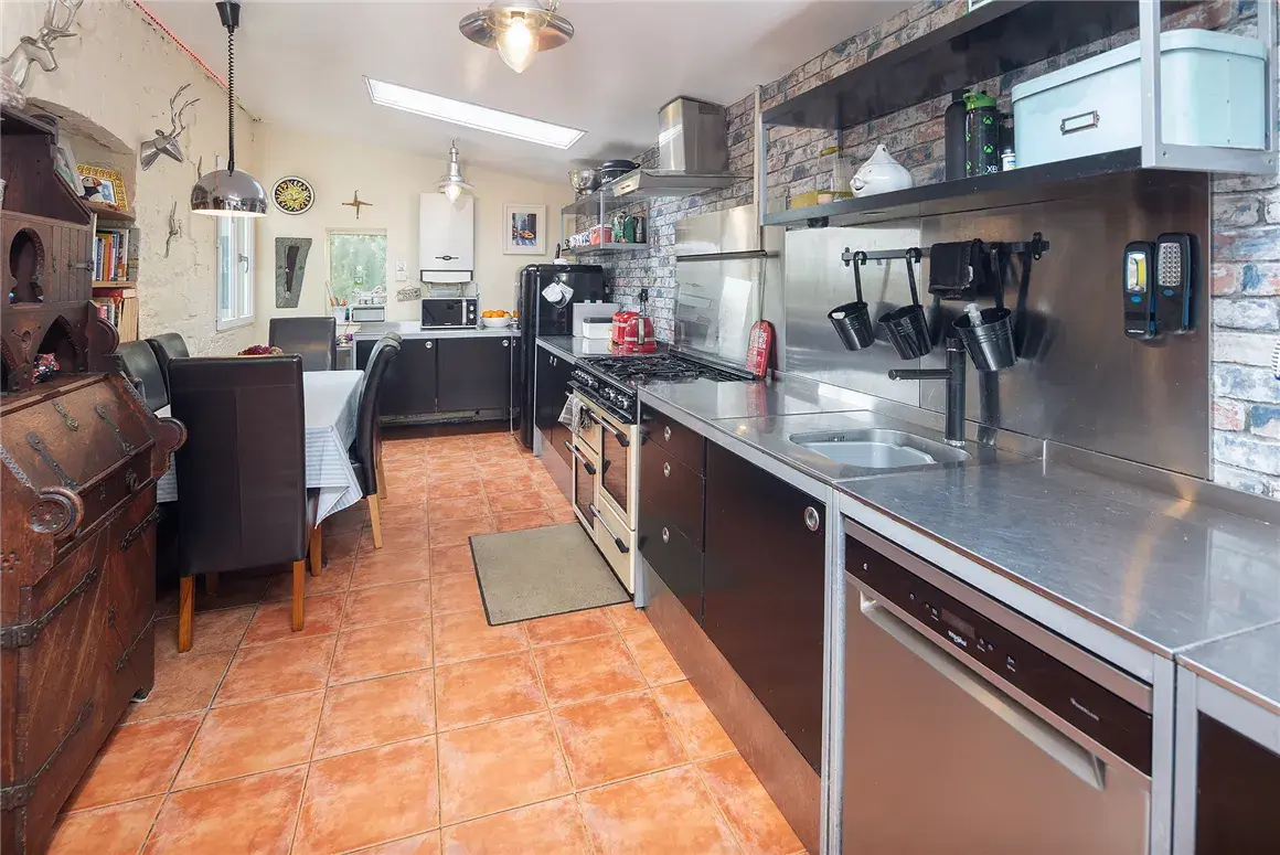 For those who love to cook, the kitchen will definitely pique your interest. With ceramic tile flooring, an insulated roof, and two Velux windows, the kitchen-dining area incorporates fitted units with stainless steel tops and splashbacks. There’s an extractor hood, a shelved larder, and plenty of countertop space.