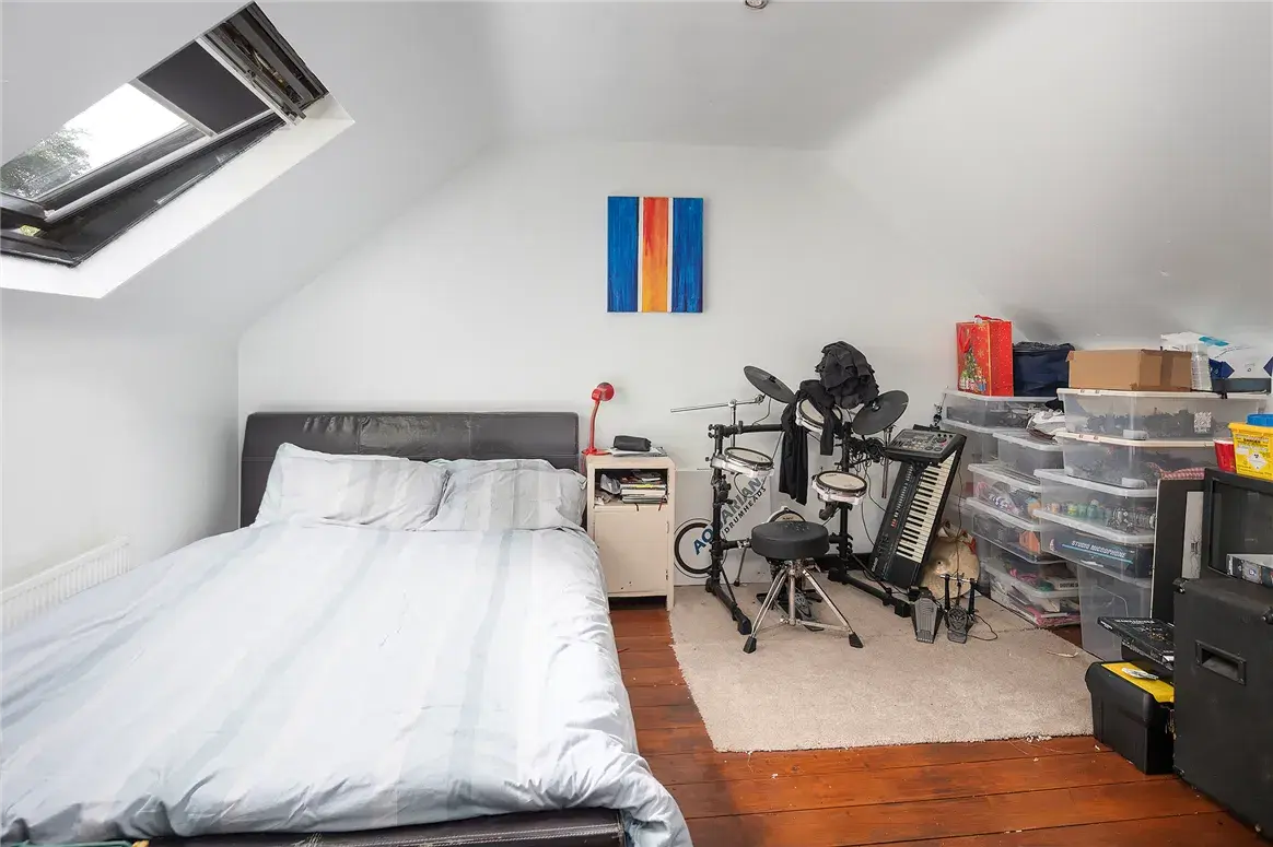 The property has three bedrooms in total, one of which is on the ground floor to the front, and has laminate flooring, fitted wardrobes, and an en suite bathroom. The other two bedrooms are located upstairs, on the first floor, and have Velux windows.