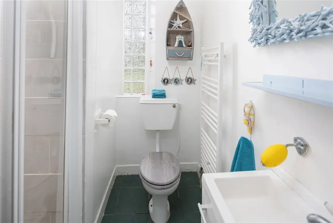 Just off the kitchen, there is a door to the rear garden area, complete with a little nook and utility block, where you’ll find a sink and washing machine. Out the back, there is a beautiful patio area that’s ideal for long evenings dining al fresco or entertaining friends. There’s also ample space for parking, and a large shed with a concrete floor that would make for a fantastic workshop studio, or extra external storage.