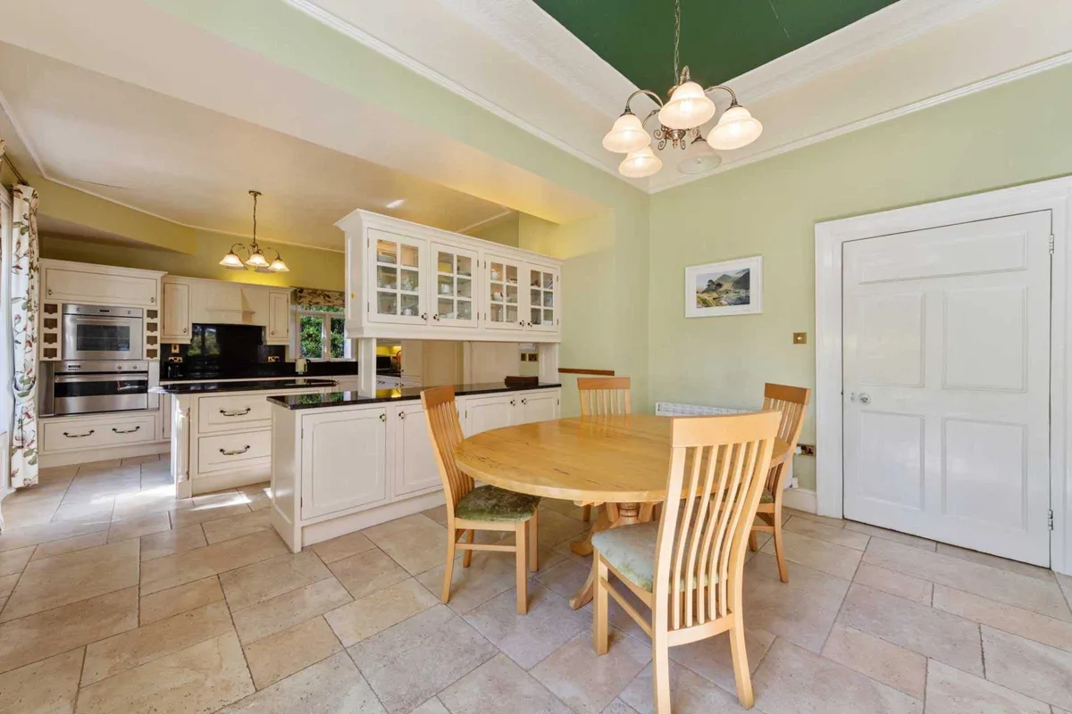 To the left of the entrance hall is the dual aspect drawing room with a feature bow window, marble fireplace, and polished timber floors. Double doors lead through to the large kitchen breakfast room with cream painted timber cabinets, polished granite worktops and integrated appliances.