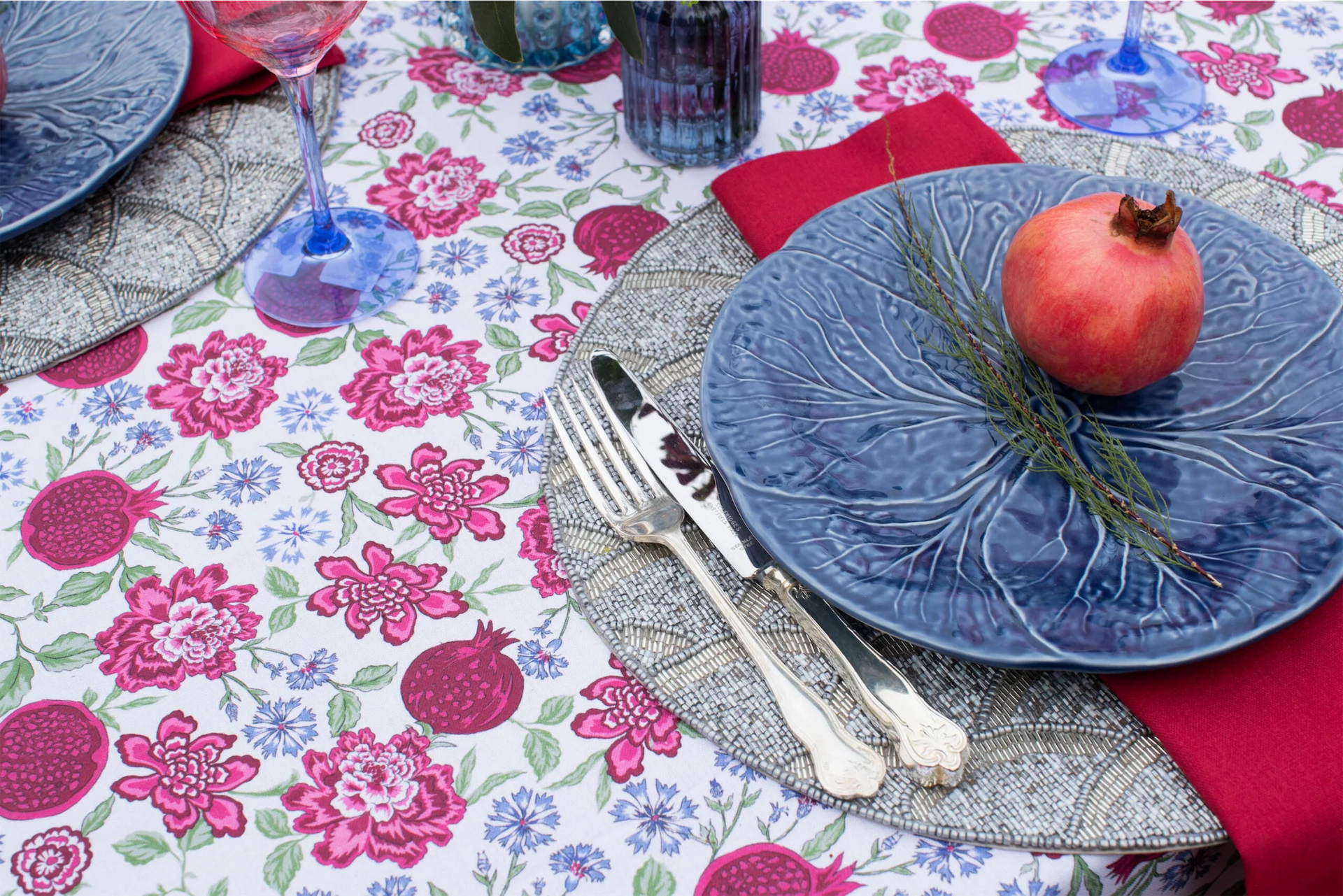 The collection contains two new prints – Pomegranate and Tamarisk. Inspiration for the Tamarisk tablecloth comes from the fact that Tamso is named after the tamarisk flower. Tara has created a tablescape to work with the prints, pairing them with napkins in two new colourways – moss green and claret, which are especially perfect for autumn and winter table settings, while the new print will work with tablescapes throughout the year.