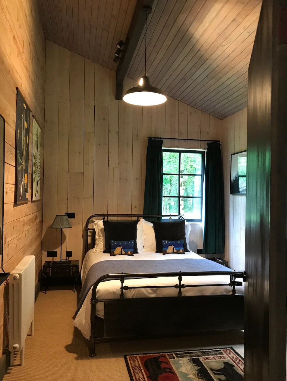 Inside, natural materials and a woodland-referencing colour palette are juxtaposed with industrial elements more akin to the Ace hotel group – black brushed metal pendant lamps, cabinets, mirror and clothes hangers on a rail in lieu of a wardrobe – which creates a pleasing frisson, while lakeside cabins have a lighter, more Scandinavian feel and palette.