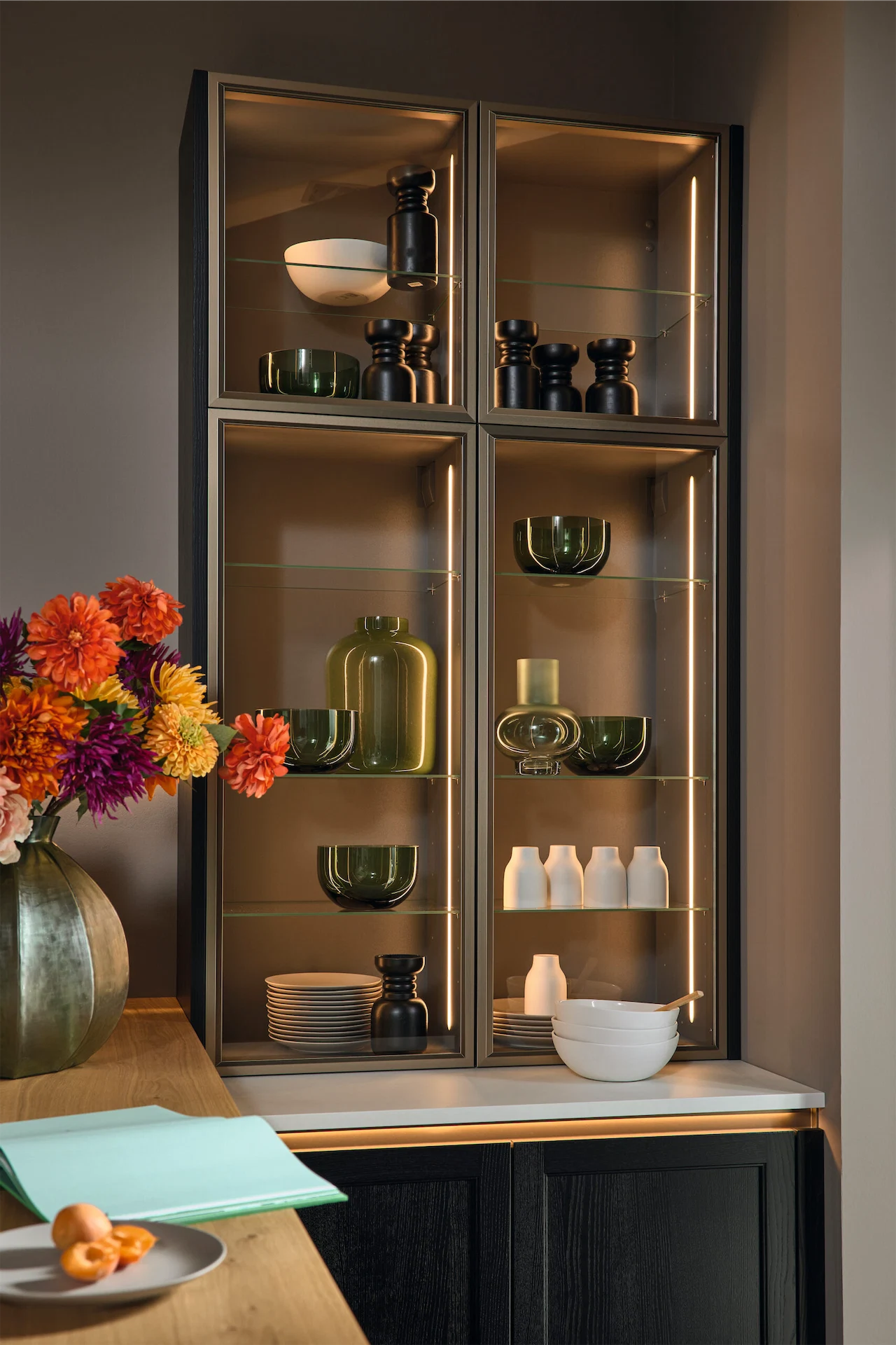 “A wine fridge can be installed underneath the bar cabinet. Everything is close at hand when serving guests and the bar cabinet is an attractive feature in the kitchen.”
