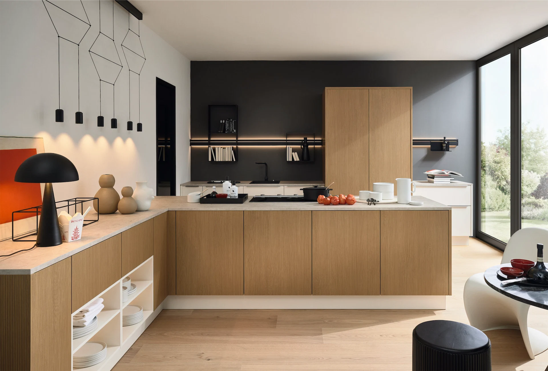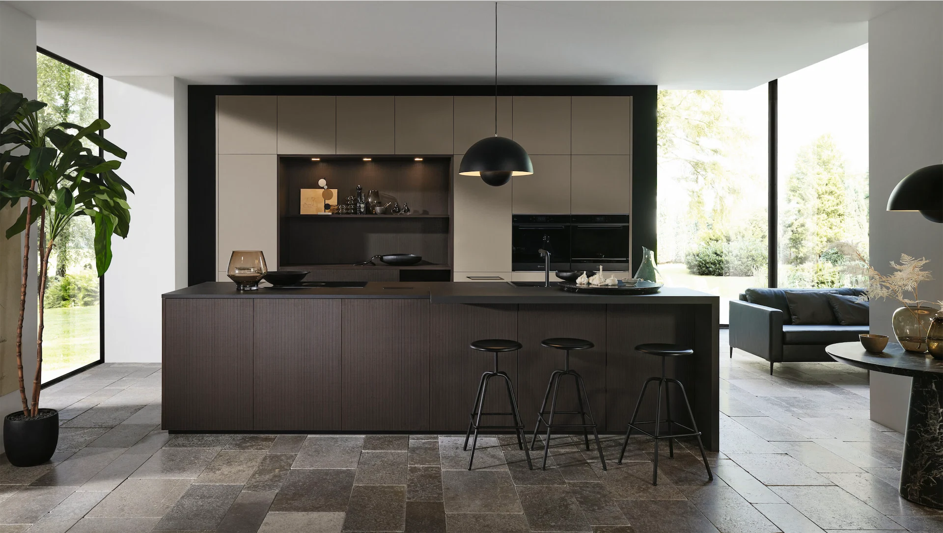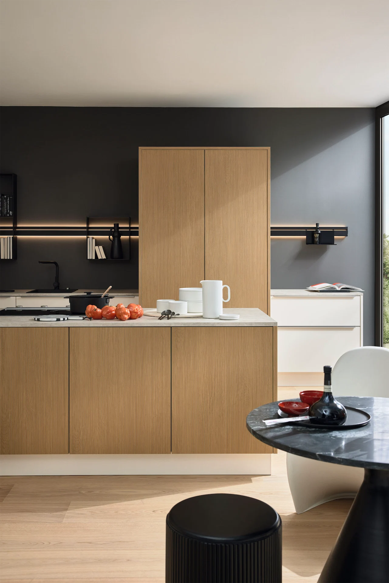 “These grooved doors work really well on one area of the kitchen such as an island or tall unit, providing a contrast to the smooth, sleek surfaces. The interplay of lines creates a dynamic effect and adds texture and interest to the kitchen.”